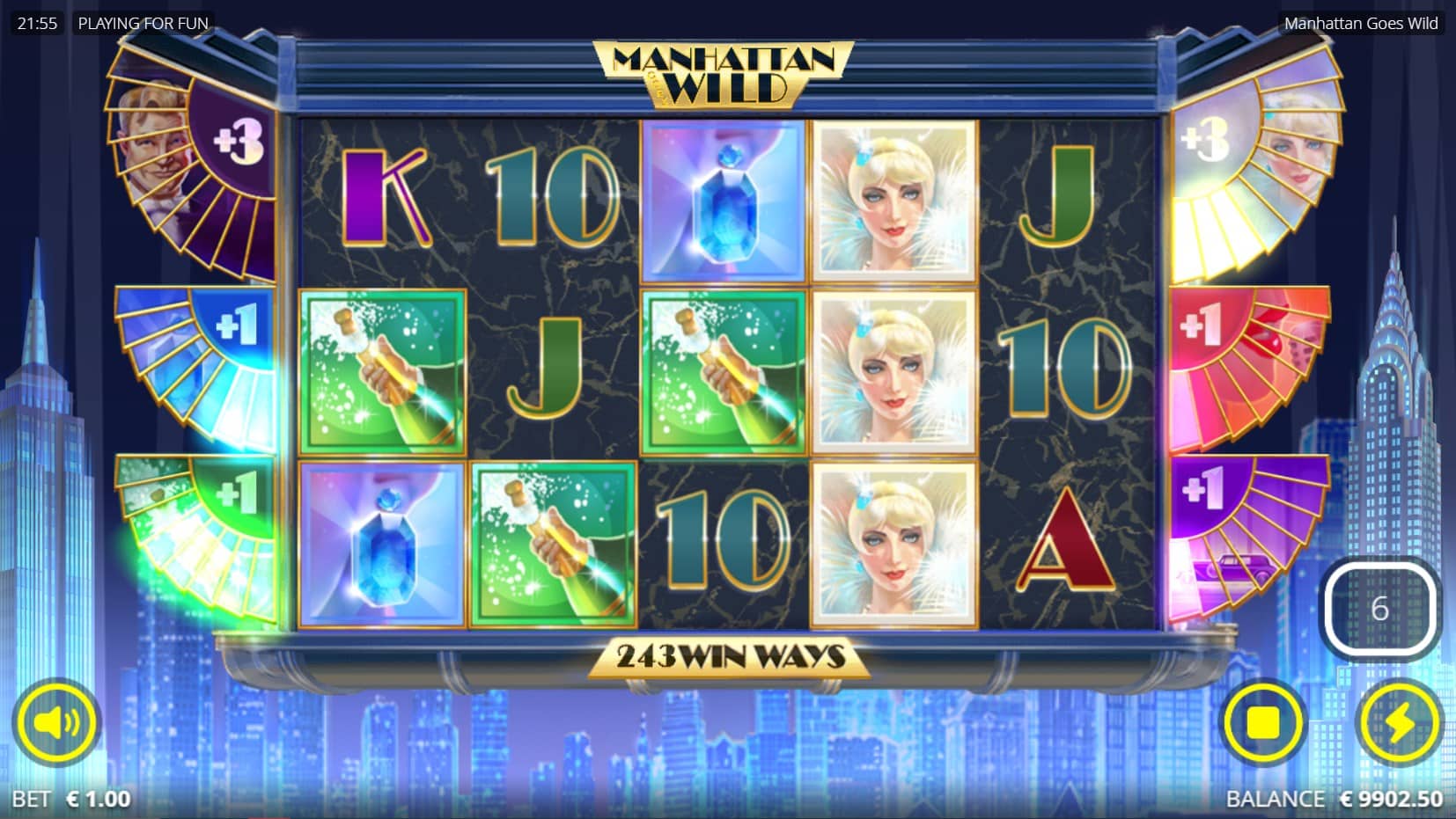 Manhattan Goes Wild operates on a 5×3 reel setup with 243 ways to win, where matching symbols land on adjacent reels from left to right starting from the leftmost reel. Wins are calculated by the number of matching symbols on a payline, with the highest-paying combination per way awarded. The base game emphasizes stacked Wilds, which appear fully stacked and boost combination potential significantly.