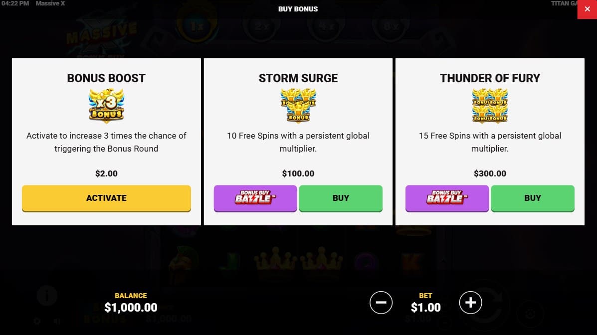 The bonus features in Massive X center on free spins modes enhanced by the persistent global multiplier, which carries over from the base game and continues building via tumbles without resetting between them. Landing three Bonus Symbols triggers the Storm Surge round with 10 free spins; four symbols activate the superior Thunder of Fury with 15 free spins. Both retain the 6×5 Scatter Pays grid and tumbling mechanics, where cascades indefinitely boost the multiplier—starting from its current level—and apply it globally to all cluster wins, potentially leading to massive accumulations over prolonged sequences.