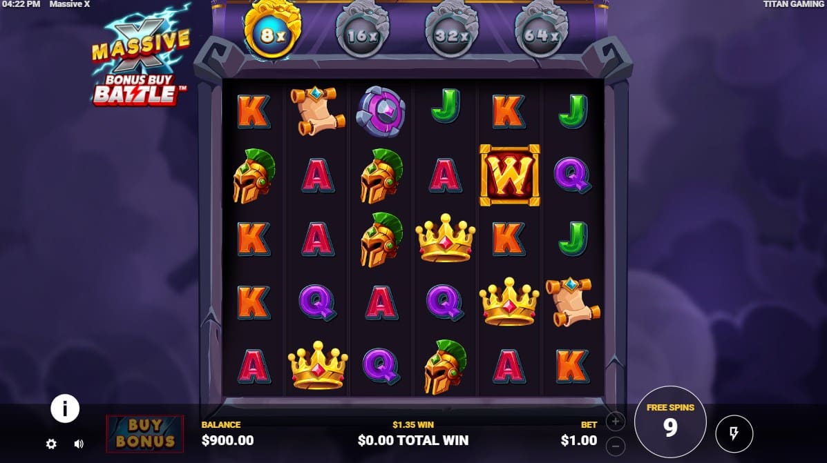 Massive X utilizes a 6×5 reel grid with Scatter Pays, requiring clusters of eight or more identical symbols anywhere on the reels to form a win. This pay-anywhere system replaces fixed paylines, allowing payouts to emerge fluidly across the grid based on cluster size and symbol value. Players begin by setting their bet and initiating a spin; matching clusters then pay out according to the paytable, where premium symbols like crows and helmets deliver the highest rewards compared to lower-value elemental icons.
