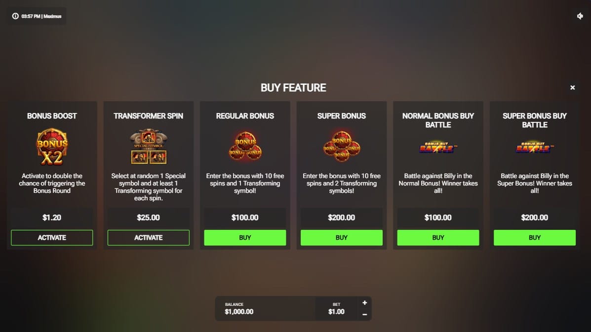 Maximus shines through its innovative bonus features, centered around the Transformation mechanic and escalating free spins modes, with a unique competitive buy-in option. The Transformation Feature activates randomly during any base game or free spins spin, selecting random symbols that unite and convert into the same high-value icon, forming massive clusters for enhanced payouts. This keeps gameplay tense and rewarding.