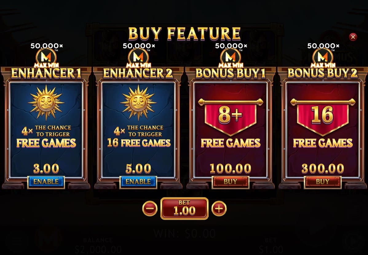 Access is enhanced by two Game Enhancers and two Bonus Buy options, all enabling DOUBLE MAX mode for a 50,000x cap (versus 25,000x base). The table below outlines these: