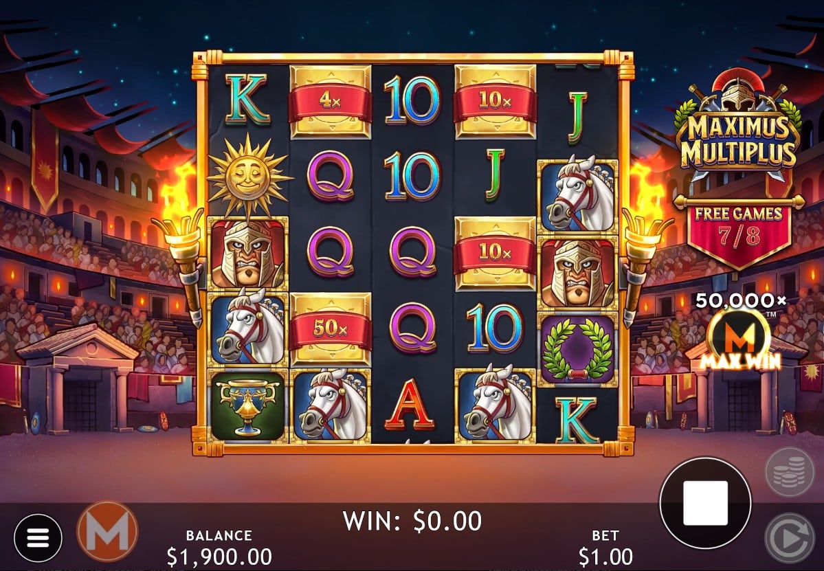 Bonus features in Maximus Multiplus extend the base mechanics into high-stakes territory, emphasizing multiplier persistence and collection amplification. The main attraction is the free spins round, activated by 3, 4, or 5 Scatters landing anywhere, granting 8, 12, or 16 spins accordingly. Here, all Wild Multipliers that appear turn sticky, locking in place for the entire feature to facilitate ongoing accumulation and heightened collections. Retriggers via 3 additional Scatters award 4 extra spins, prolonging opportunities for grid saturation.