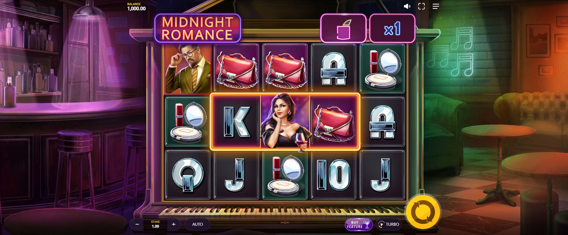 The design of Midnight Romance oozes nightclub aesthetics with a playful twist. The game is set against a sleek bar backdrop glowing in neon hues of purple, green, and blue. The slot grid resembles a nightclub piano stage, surrounded by velvet couches and colorful lighting—a setup that brings to mind smooth jazz and midnight flirtations.