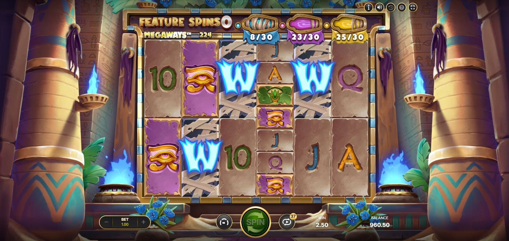 Payouts emphasize premium symbols and wilds. Low pays (10, J, Q, K, A) award 0.5x to 1.5x the stake for six-of-a-kind. High pays—Ankh (2x), lotus flowers, Eye of Horus, and scarabs (up to 30x)—offer stronger returns for full lines. Wilds pay 30x for six and substitute universally. The medium/high volatility manifests in steady avalanche hits punctuated by feature-triggered spikes, with the 5,000x max win achievable through optimal wild cascades. Payout behavior favors sustained play, as feature bars persist across sessions in some implementations, building toward bonuses over time.