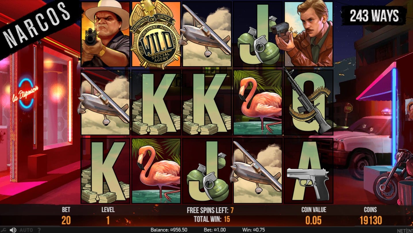 The slot employs a classic 5-reel, 3-row grid with 243 ways to win, diverging from traditional fixed paylines to provide more dynamic winning possibilities through adjacent symbol matches from left to right. This structure supports a cinematic experience enhanced by high-production visuals, animations, and multiple features that evoke tension and drama. With medium volatility, an RTP of 96.23%, and a maximum win potential of 1,506x the stake, Narcos caters to a broad audience, including fans of the series, casual players, and those seeking thematic immersion alongside balanced payout potential. Betting options span from €0.20 to €400, ensuring accessibility across various bankroll sizes.
