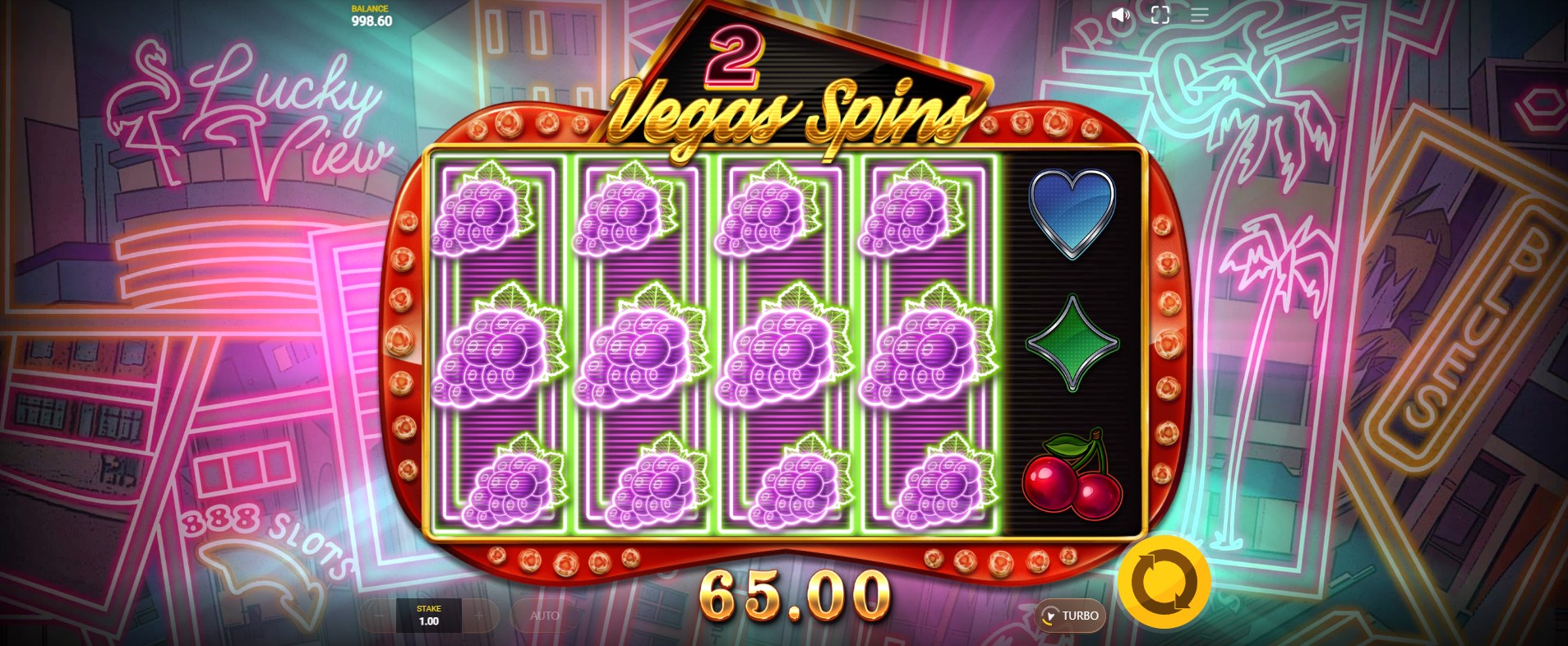 The symbols are a classic blend: hearts, diamonds, clubs, spades (low pays), and cherries, grapes, horseshoes, bells, and flaming 7s (high pays). Each icon is rendered with crisp neon-style tubing, and during the Vegas Spins bonus round, these symbols transform into oversized, glowing variants called neon super symbols, enhancing the electric ambiance.