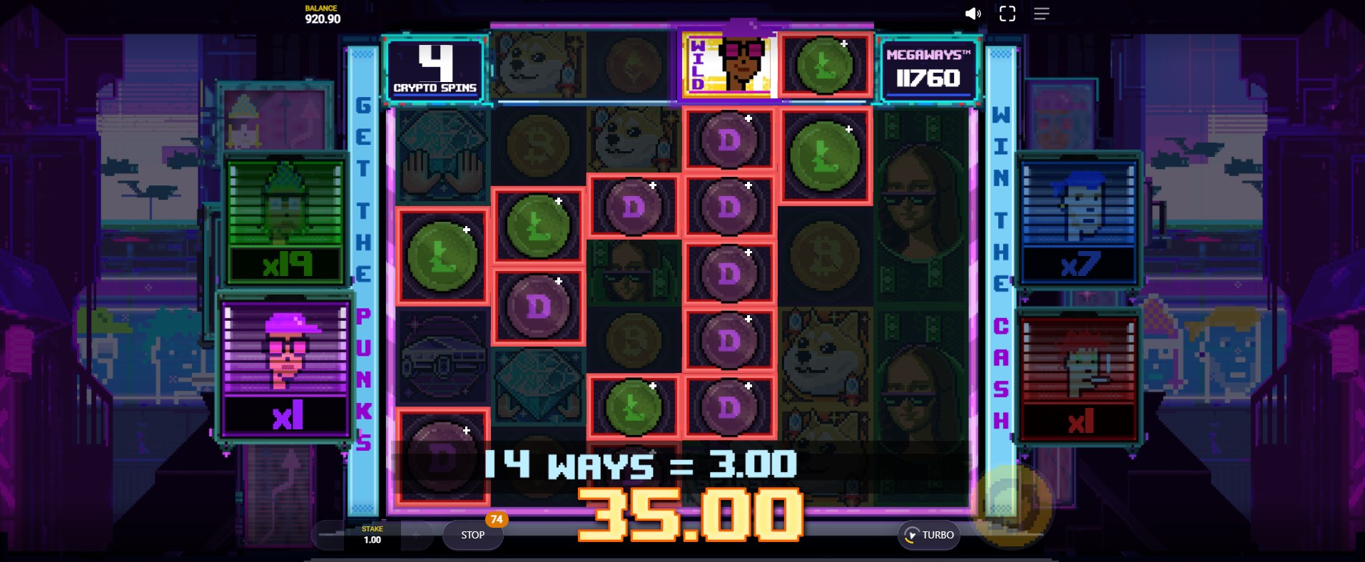 Each spin can result in a different number of active Megaways, keeping the gameplay unpredictable and engaging. There are no standard wilds—wild action is entirely driven by the Crypto Punk wilds on the top reel.
