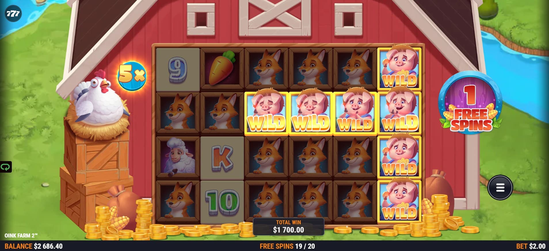 When two or more wild symbols land in the same row, and there are empty grid spaces between them, the chicken fills the gap with additional wilds.