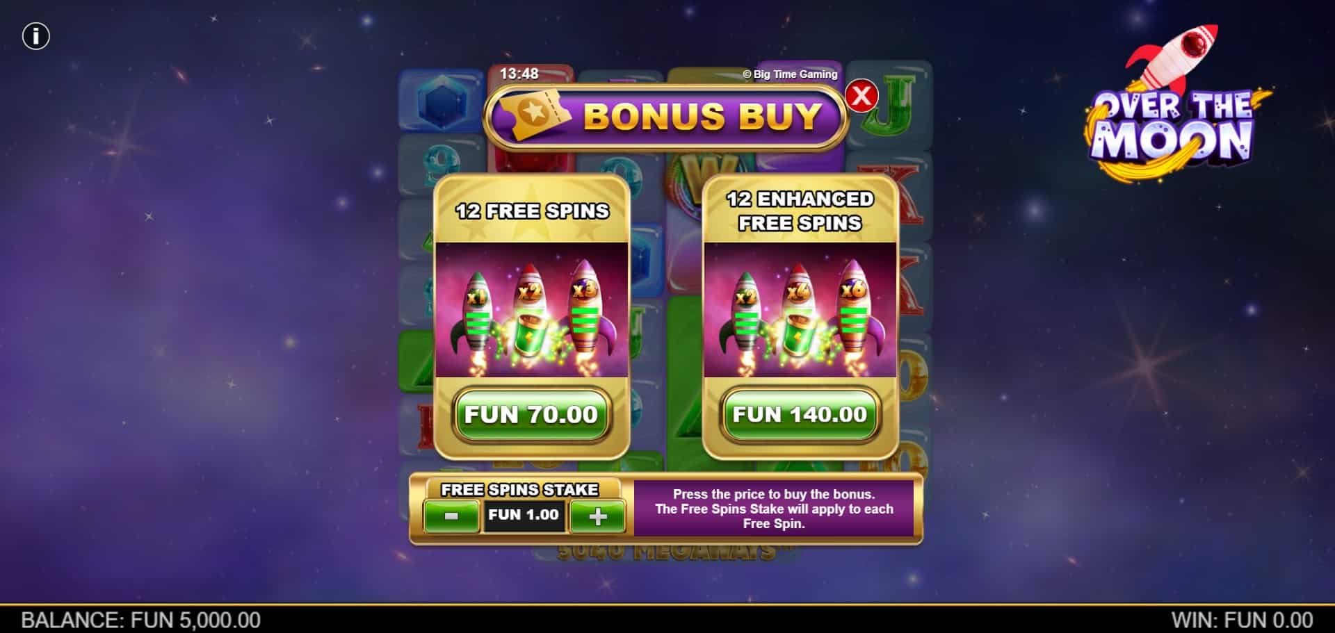 Over the Moon excels with layered bonus mechanics that transform standard Megaways gameplay into a multiplier-driven spectacle. Central to both base and bonus play are Rockets, which can land up to three at once on any spin or reaction. Each displays multipliers of x1, x5, or x10 and carries up to three fuel cells. Rockets deplete one fuel cell per reaction unless refueled, vanishing when empty. Their persistent multipliers apply to qualifying prizes, amplifying potential across chains.