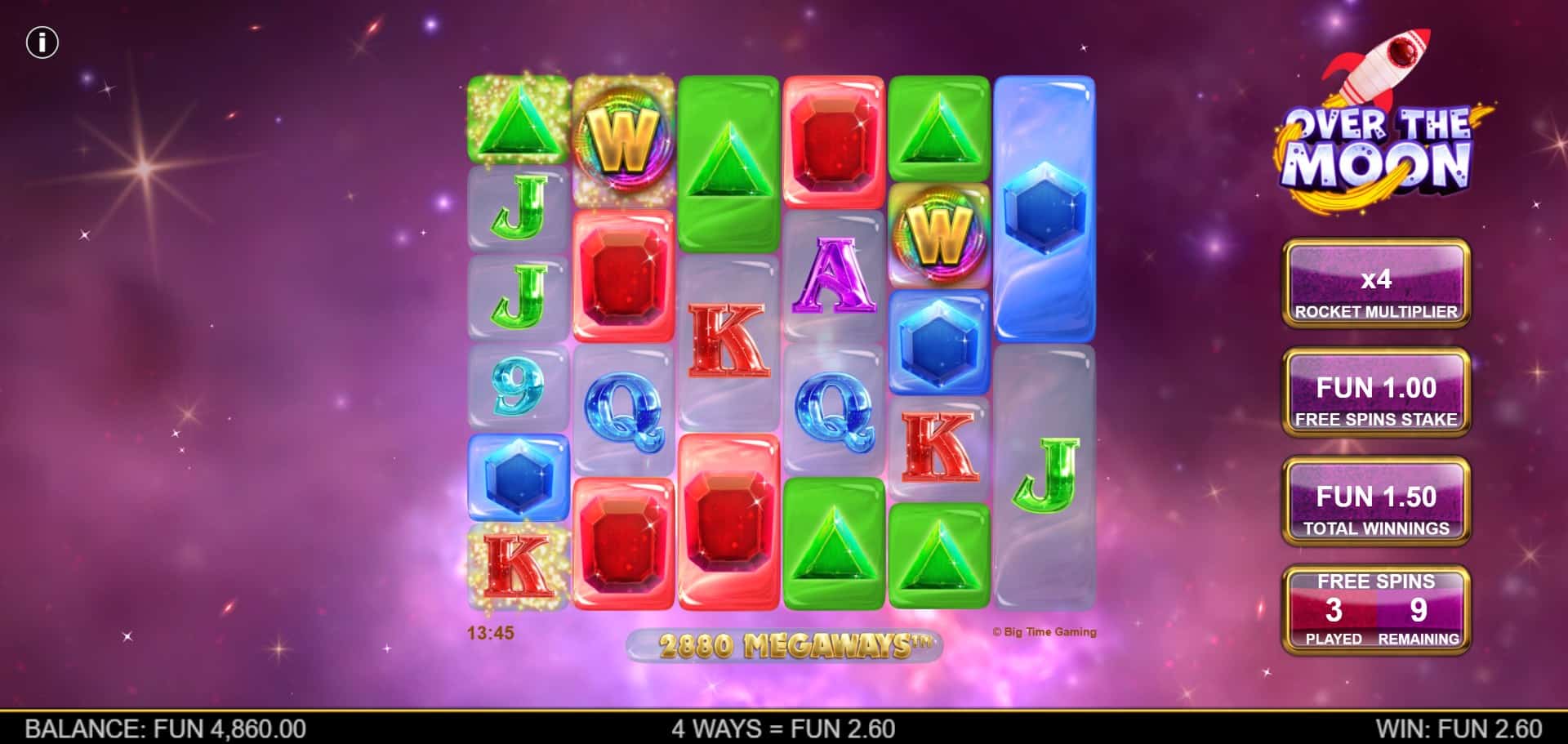The design of Over the Moon delivers a visually striking cosmic aesthetic, immersing players in an otherworldly environment. The reels are framed against a backdrop of sparkling galaxies, swirling nebulae, and twinkling stars, evoking the sensation of drifting through deep space. Although the moon itself is not prominently featured, the overall galactic theme is cohesively executed with high-quality visuals that maintain clarity during gameplay.