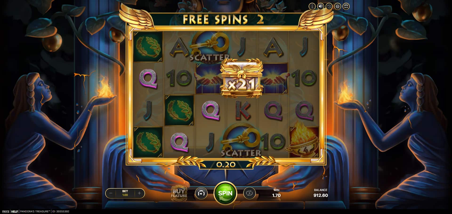The visual presentation of Pandora’s Treasure evokes a polished sense of ancient antiquity, centered around classical Greek temple aesthetics. The backdrop showcases marble columns intertwined with trailing ivy, burning braziers casting a warm glow, and statuesque figures standing sentinel around the reels. This creates a serene, ceremonial atmosphere that aligns seamlessly with the mythological theme.