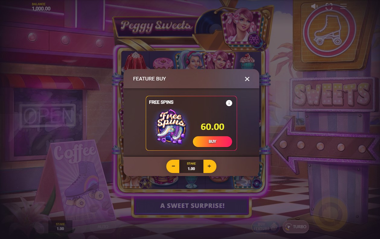In a somewhat unusual move for Red Tiger, Peggy Sweets includes a Bonus Buy feature, allowing players to purchase instant access to the free spins round for 60x the base bet. When used, this has a slightly tweaked RTP of 95.74%.