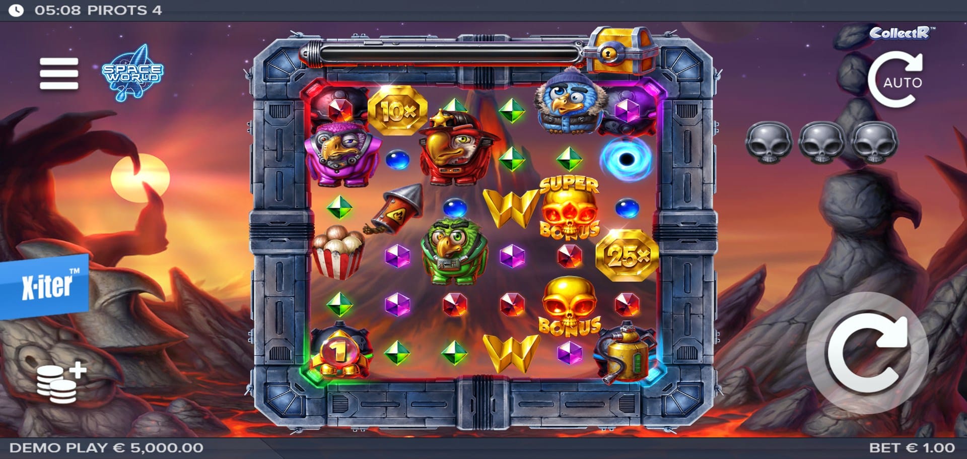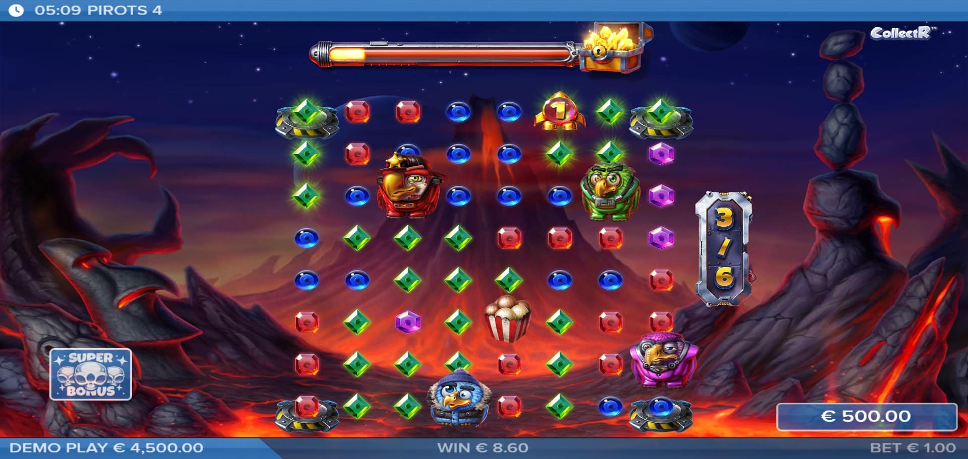 Pirots 4 is built on a 6×6 grid without traditional paylines. Instead, the CollectR system drives progression: birds roam the grid collecting gems, wilds, coins, scatters, feature symbols, and triggering special mechanics. As long as at least one bird can move, the round continues.