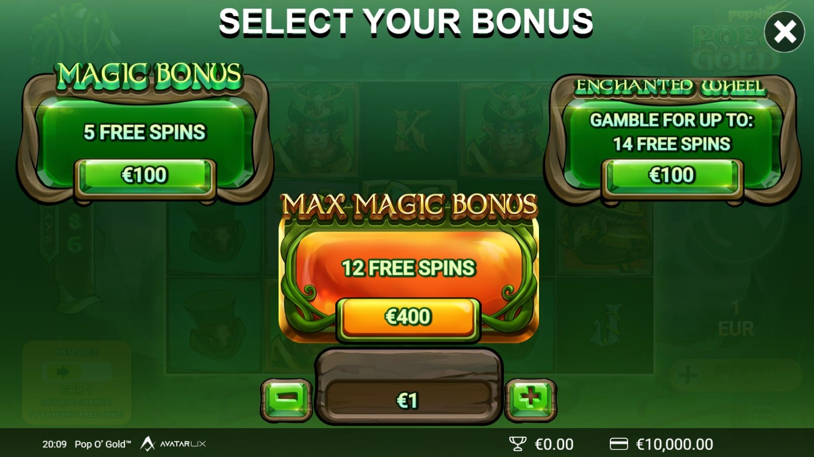 Pop O’ Gold PopWins offers a betting range of €0.20 to €100 per spin, making it versatile for both low-stake and high-stake players.