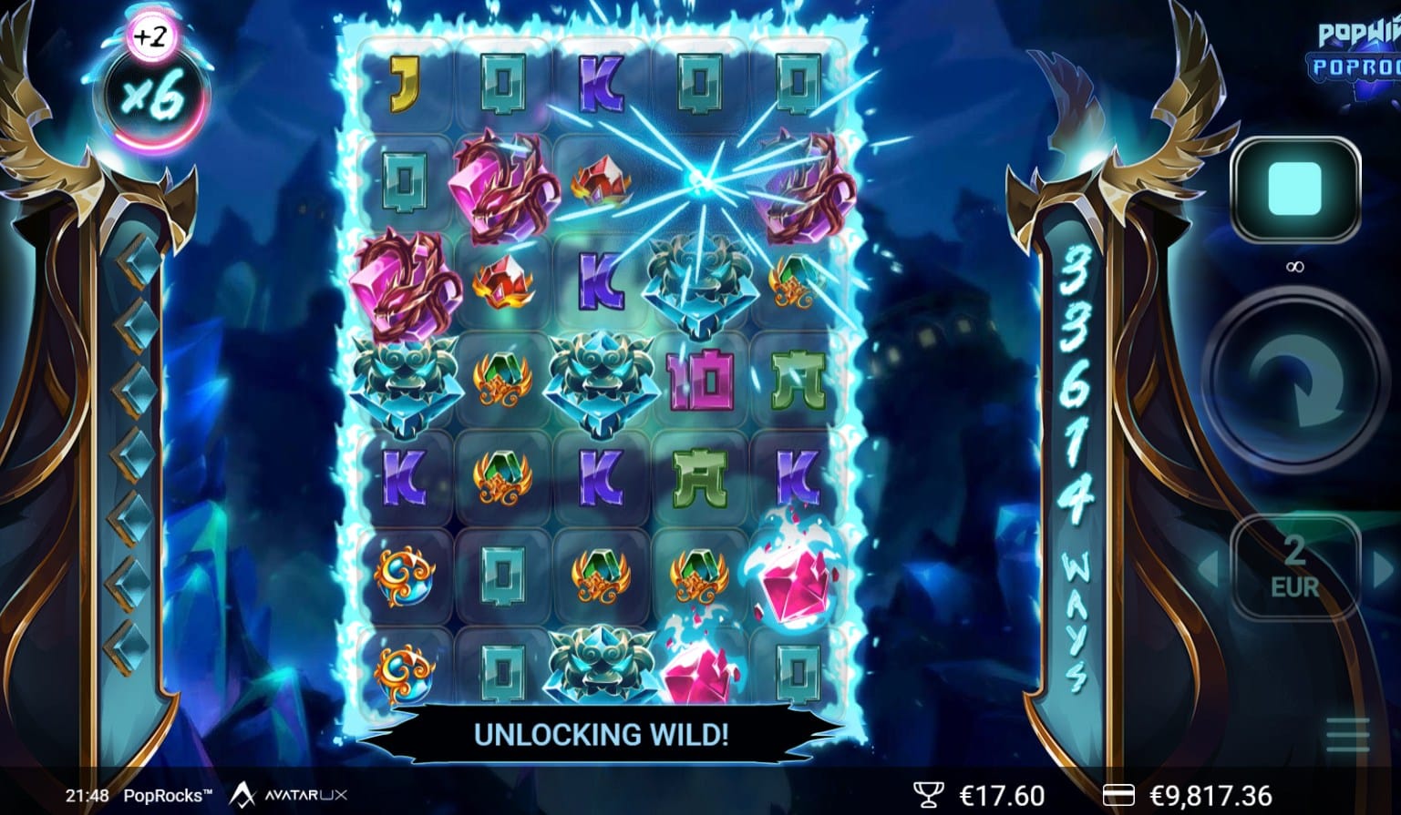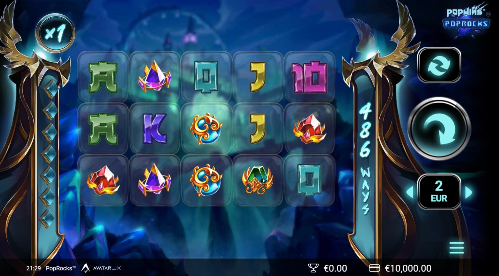 The grid design evolves dynamically as reels expand, with glowing highlights and shifting animations adding to the sense of progression. While the overall look may feel slightly generic compared to later AvatarUX titles, PopRocks delivers a dramatic and immersive environment that fits its ambitious gameplay style.