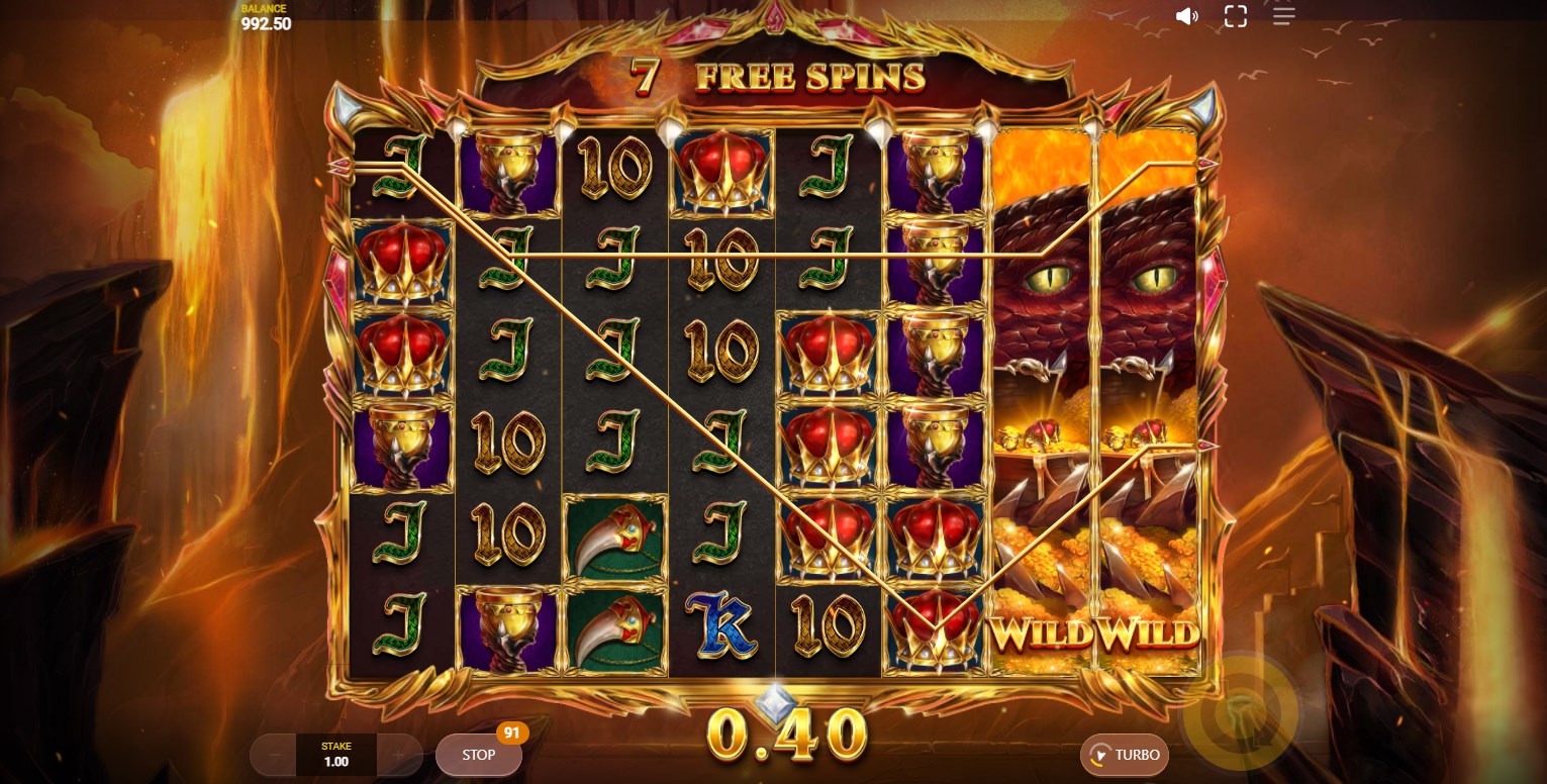 In the base game, the dragon may randomly fly across and drop a Dragon Wild on the rightmost reel.