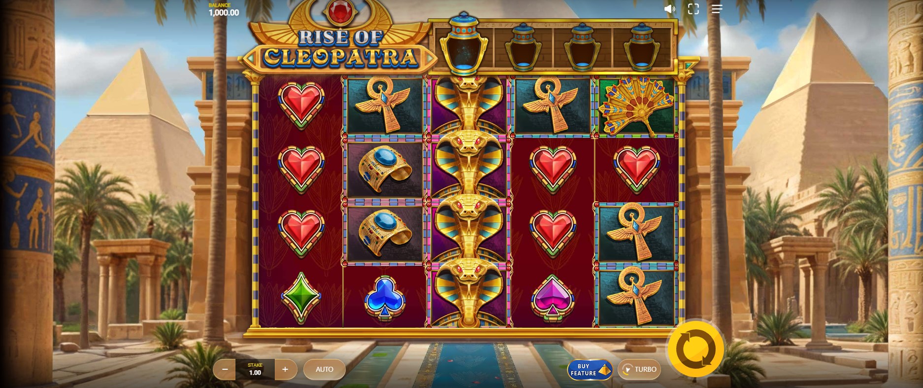 Set amidst a golden Egyptian vista with towering pillars, sandstone monuments, and pyramids in the background, Rise of Cleopatra confidently delivers the visual splendor fans of ancient civilization slots expect. The reels themselves sit between ornate gold frames, while at the top of the screen, feature jars await collection progress, acting as a visual reminder of the game’s core mechanic.