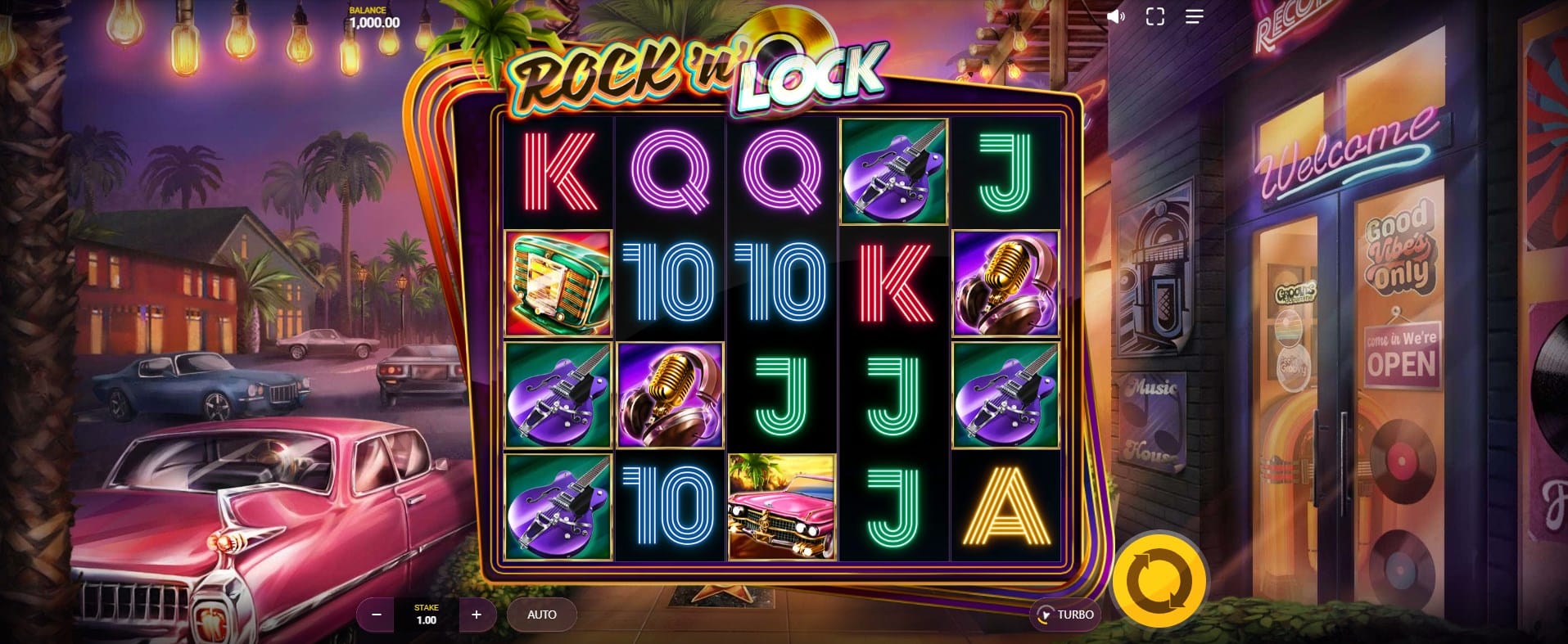 The visual presentation of Rock’N’Lock is as vibrant as a vintage diner. Set in what appears to be a sunny strip of retro Los Angeles, the reels are bordered by flashing lights and neon tubes. A pink convertible is parked in the foreground, palm trees sway in the distance, and a sign reads “Welcome” in candy-colored script, inviting players into a world of rockabilly flair.