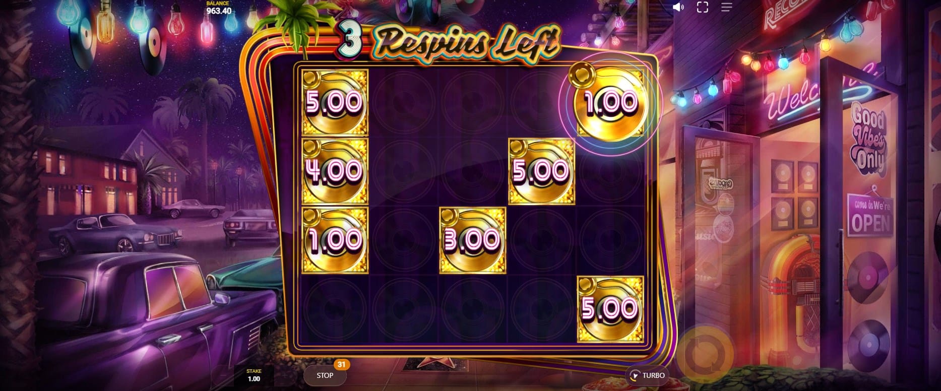 This is the centerpiece of the game. The Lock the Records feature is triggered by landing three or more Record scatter symbols (Gold or Platinum) on a single spin. These symbols are then locked in place, and players receive 3, 4, or 5 respins depending on how many records initially triggered the feature.