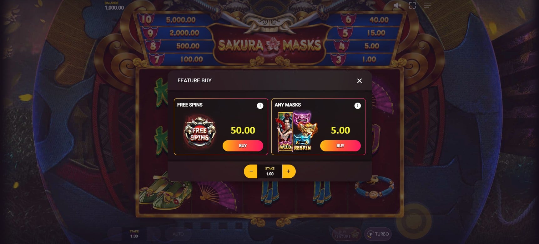 The Prize Ladder is a core attraction. Depending on how many masks land in a single spin (up to 10), players can earn fixed prizes ranging from 1x to a massive 5,000x their stake. Notably, Sakura Wilds count as three masks, making them particularly powerful in raising the prize count. The base game introduces both Respin Masks and Multiplier Masks, which respectively trigger a respin or apply a 2x or 3x multiplier to prize ladder rewards.