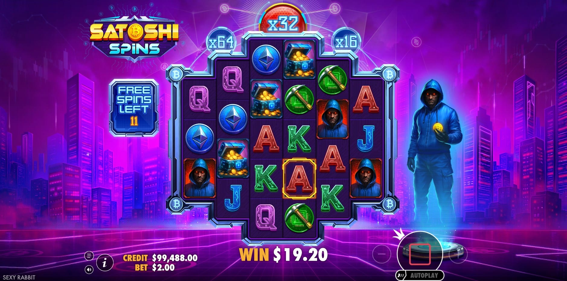 Satoshi Spins is a video slot developed exclusively by Sexy Rabbit and published by Pragmatic Play, released on October 31, 2025. The game centers on a cryptocurrency theme, drawing inspiration from Satoshi Nakamoto, the pseudonymous creator of Bitcoin, depicted as a mysterious dark figure in a blue hoodie with glowing red eyes. It features a neon-wave aesthetic set in a futuristic cyberspace environment, filled with Bitcoin symbolism, including holographic elements and references to cryptocurrency culture like candlestick charts. Gameplay revolves around a dynamic ways-to-win system with tumbling reels, stacking multipliers, wild substitutions, marked symbols, and a free spins bonus round enhanced by a gamble option. This high-volatility title targets players who enjoy crypto-inspired themes, neon visuals, and mechanics focused on escalating multipliers and chain reactions, appealing to those seeking high-risk, high-reward sessions in a modern slot format.