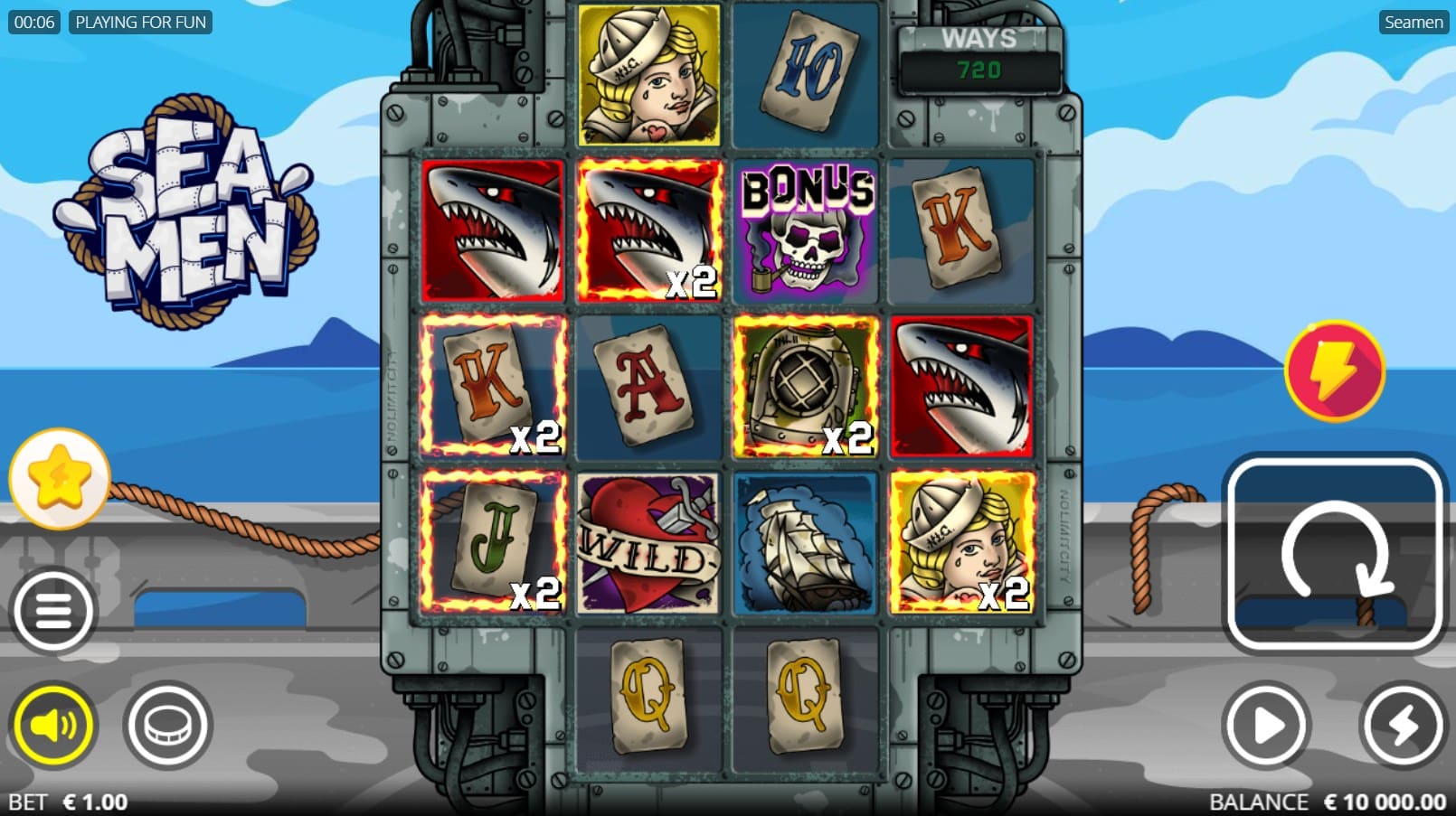 The visual design of Seamen adopts a cartoony aesthetic centered on a ship’s deck, with the game grid integrated into industrial machinery featuring wires, pipes, and steel elements. The backdrop showcases a vast open ocean, distant rocks, and another vessel on the horizon, evoking isolation at sea. The 4-reel grid starts as a 3-4 row structure but expands dynamically via features. Symbols include low-value stained playing cards (10, J, Q, K, A) and high-value nautical icons: a ship, diving helmet, blonde sailor, and shark. Special symbols comprise Wilds as dagger-pierced hearts, xWays as crossed swords, Bombs (coconut, regular bomb, naval mine), and Scatters as pipe-smoking skulls.