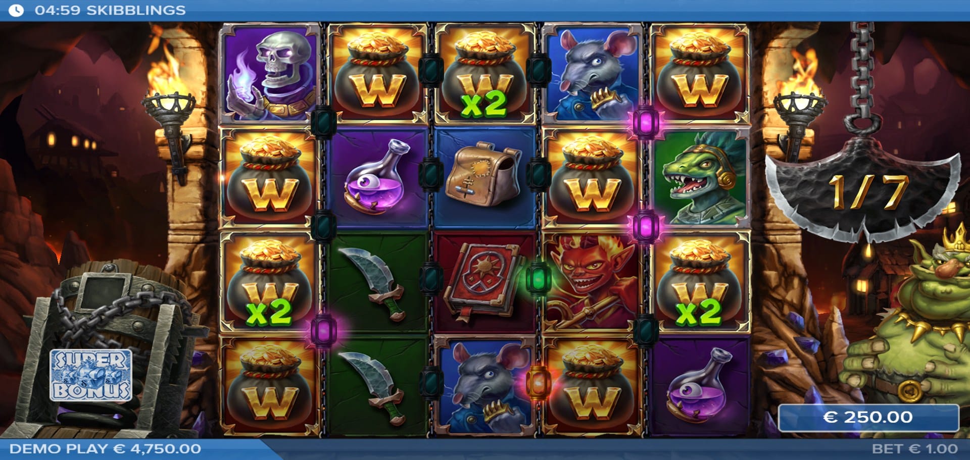 In this subterranean fantasy romp, players descend into the underground dwellings of Skibblings—small, mischievous goblin-like creatures who are tired of being stomped on and looted by surface-dwelling heroes. Their king leads the rebellion armed with a cannon capable of blasting Skibblings across the reels to trigger mystery symbols, multipliers, and big chains of avalanching wins.