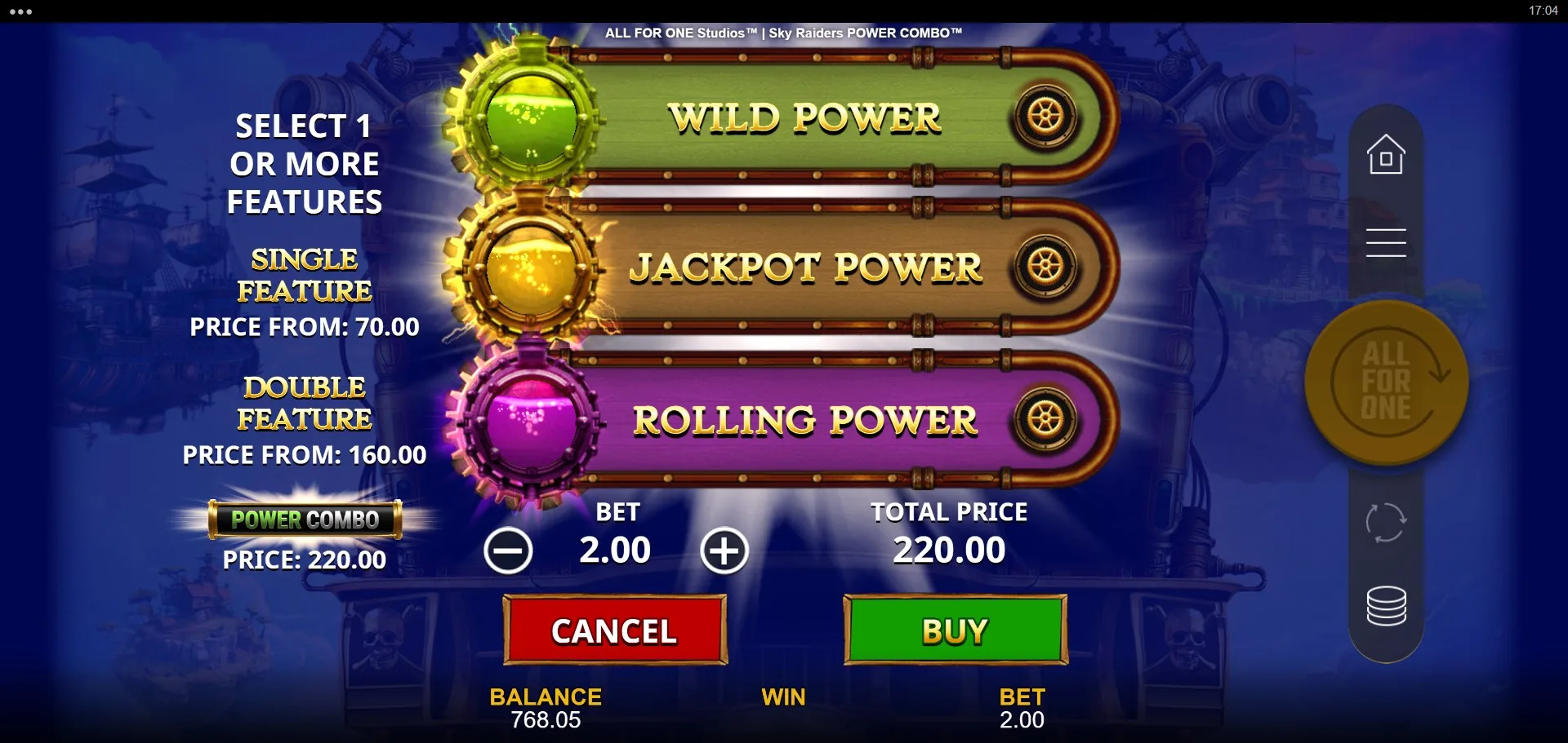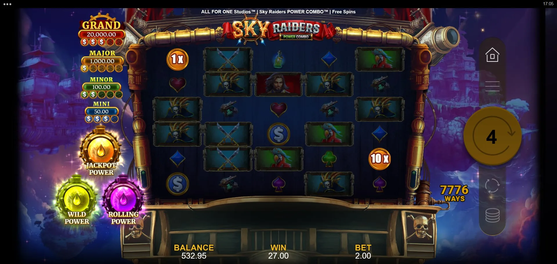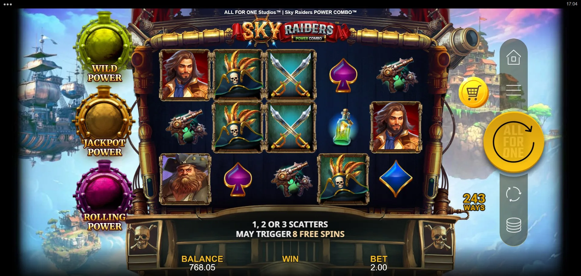 Sky Raiders Power Combo is a visually striking and mechanically engaging slot that blends 243 ways-to-win gameplay with an expandable grid, jackpot prizes, and cascading modifiers. While the Power Combo mechanic has appeared in several All For One Studios releases—and here bears a strong resemblance to 3 Powers of Zeus Power Combo—its steampunk pirate skin gives it a distinct personality.