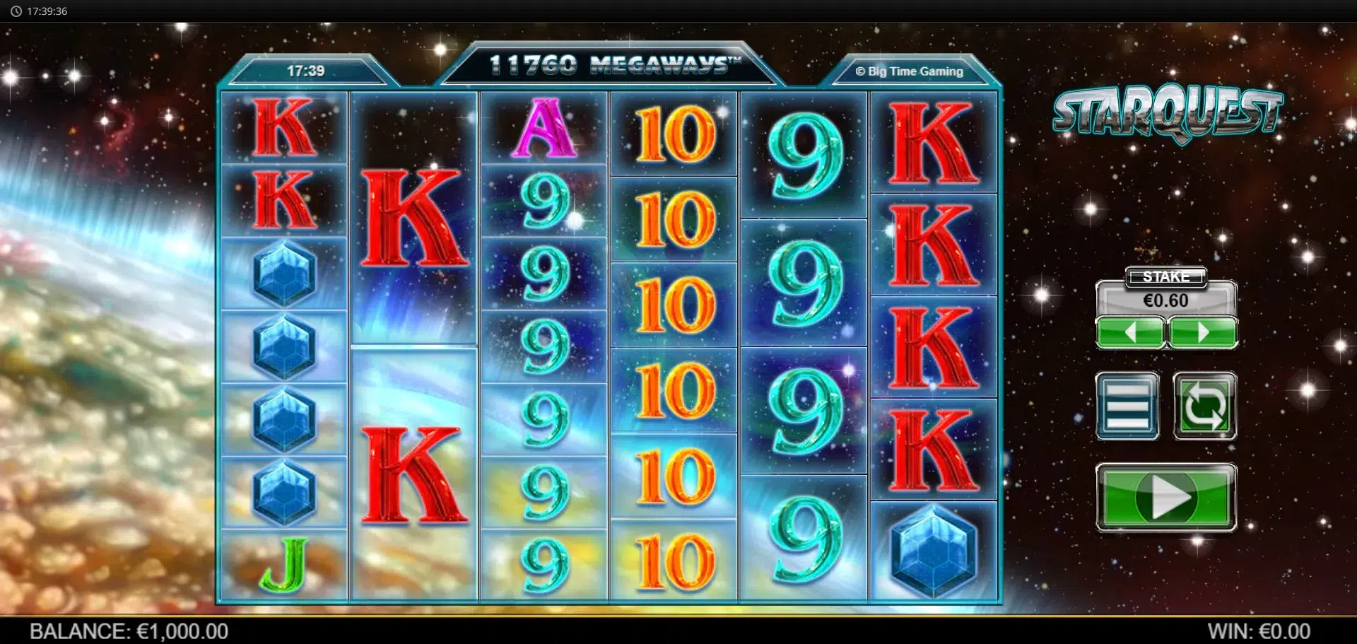 Starquest uses the Megaways engine to vary the number of symbols on each reel with every spin. This results in a fluctuating number of paylines—anywhere from a few hundred to the full 117,649. Winning combinations are formed by matching symbols from left to right, starting from the first reel.