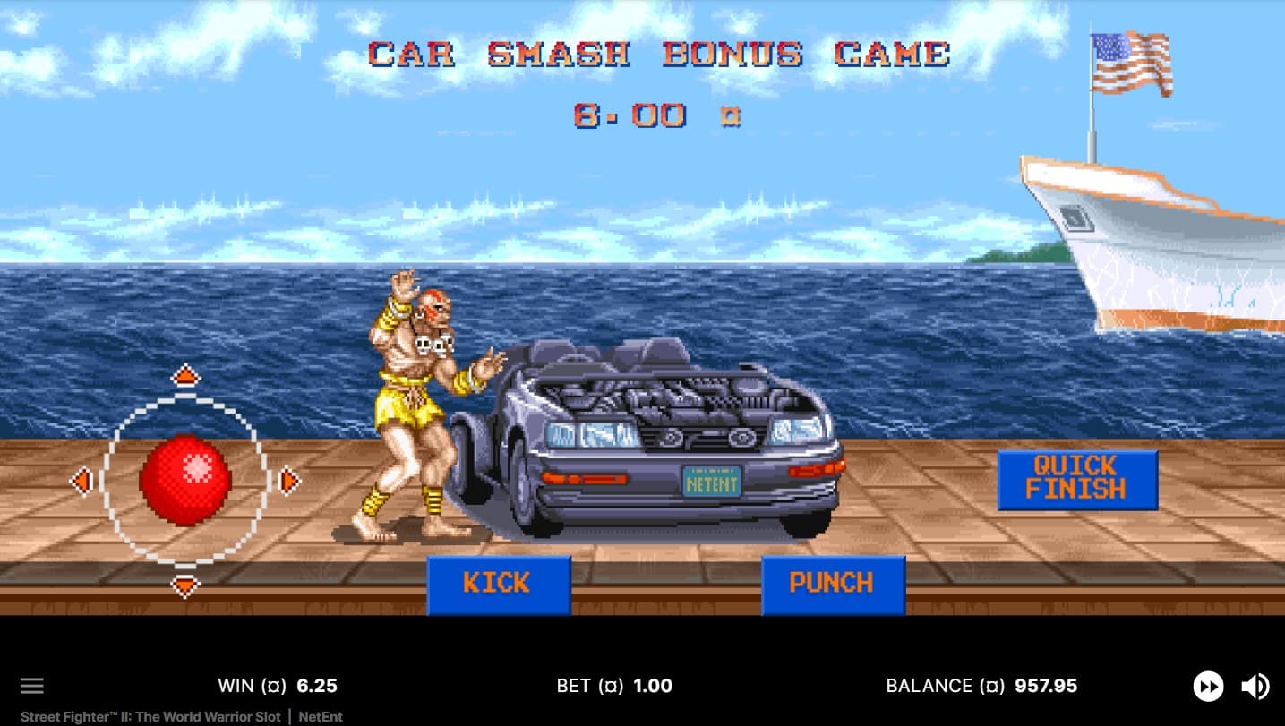 Players begin by selecting one of eight fighters, each tied to a distinct Wild modifier unlocked after filling a Wild Gauge (requires 7 wins on that fighter’s high-paying symbols). High symbols also deal damage to the opponent’s HP bar during spins; the first fighter to deplete the other’s bar ends the round. A win advances to Beat the Boss Free Spins, while a loss triggers the Car Smash Bonus Game. This progression adds strategy, as character choice influences volatility and hit frequency (18.37%–34.25% range).