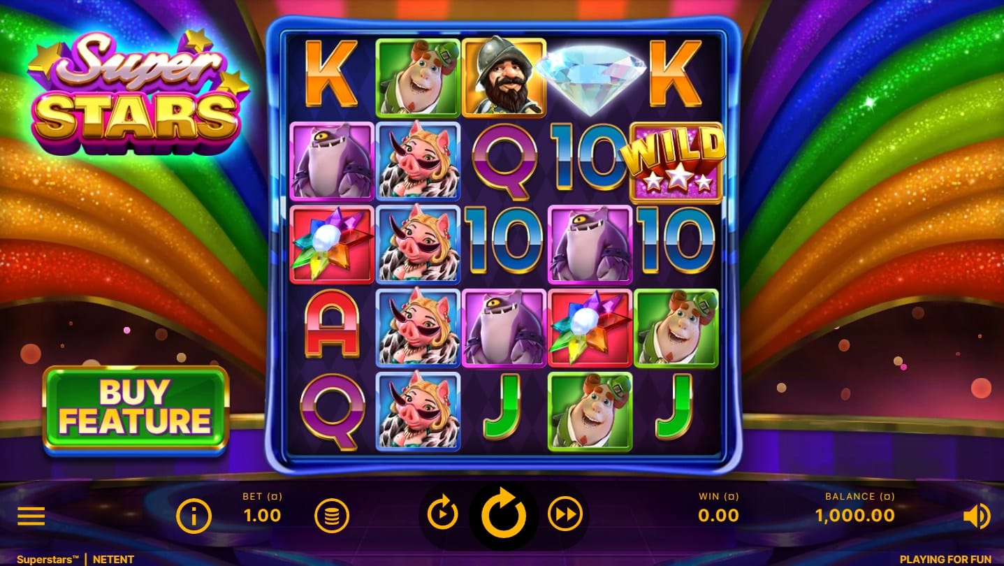 The visual presentation of Superstars features a vibrant, rainbow-colored background evoking a luxurious casino floor, creating an energetic and inviting atmosphere for the base game. Symbols are prominently displayed, with lower-paying options consisting of classic 10-A card ranks rendered in polished, thematic styling. Premium symbols showcase the five NetEnt mascots—Finn, Gonzo, Lady Pig, Brute, and the Starburst gem—each with distinct cartoon-like designs, colorful palettes, and animated expressions that add personality and flair to every spin. Animations are smooth and responsive, enhancing the lighthearted, arcade-inspired aesthetic without overwhelming the interface.