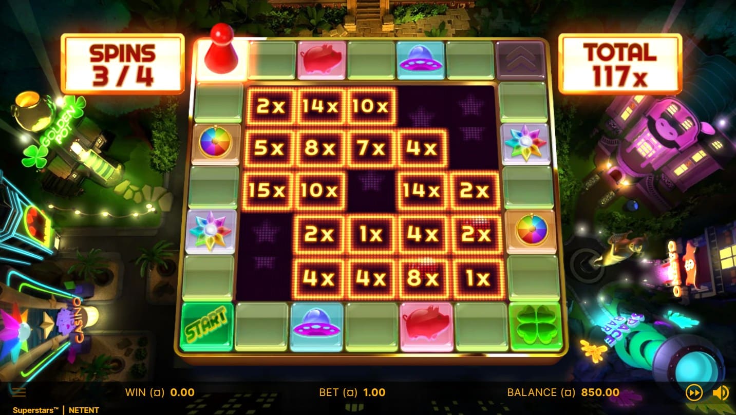 Superstars is a slot developed by NetEnt, released on October 27, 2022. This title celebrates the provider’s most iconic characters, including Finn, Gonzo, Lady Pig, Brute, and a character inspired by Starburst, combining them into a nostalgic experience on a 5×5 grid with 45 paylines. The game employs a medium/high volatility math model and offers a maximum win potential of 4,596x the stake. Gameplay revolves around standard matching in the base game, escalating into a distinctive board game-style bonus round that incorporates hold-and-win mechanics, modifiers, and character-themed features. Superstars targets loyal NetEnt fans who appreciate retro references and dynamic bonus action, blending fan service with technical reliability, including an RTP of 96.08% at the highest setting (with operator-selectable alternatives of 94.06% and 92.01%).