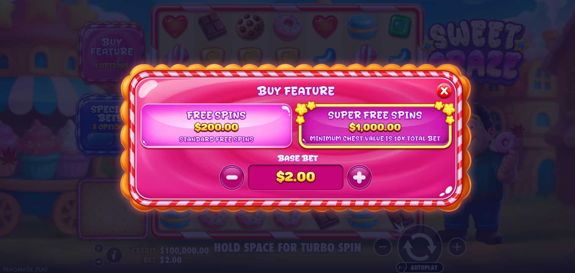 Super Spins: For 10x the base stake, guarantees a Chest symbol each round, though free spins cannot trigger while this mode is active.