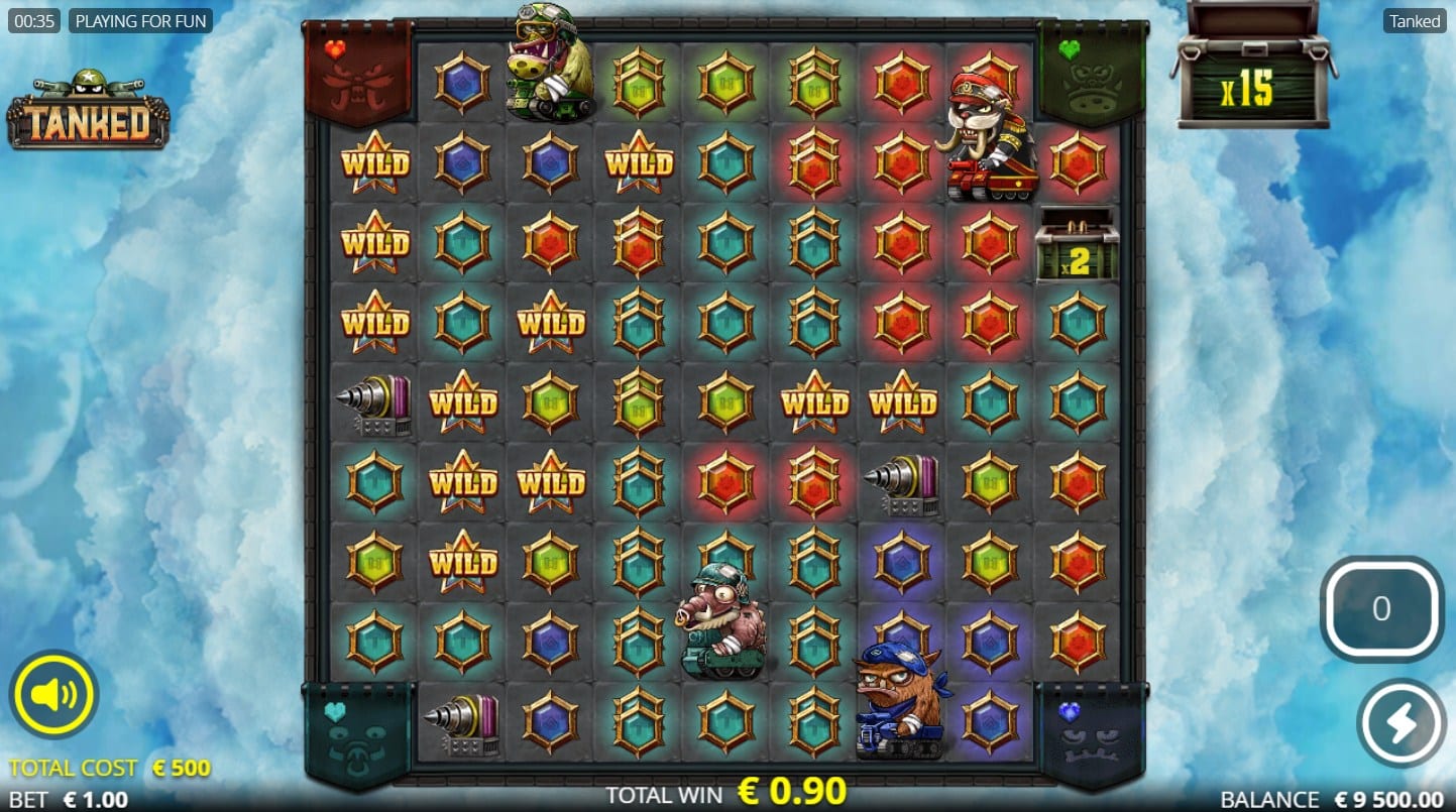 Tanked operates on a variable 6-9 reels by 6-9 rows grid using the xLoot mechanic, eliminating paylines or payways in favor of collection-based wins. Four warlords, color-coded to match symbol sets (blue/turquoise low pays at 0.05x per symbol; green/red high pays at 0.10x-0.15x), activate on every spin. They move adjacent to horizontally or vertically aligned paying symbols of their color or any feature symbols, collecting them to form wins paid via an escalating overall multiplier. Wild symbols substitute for all pays and are collectible by any warlord, adding flexibility.