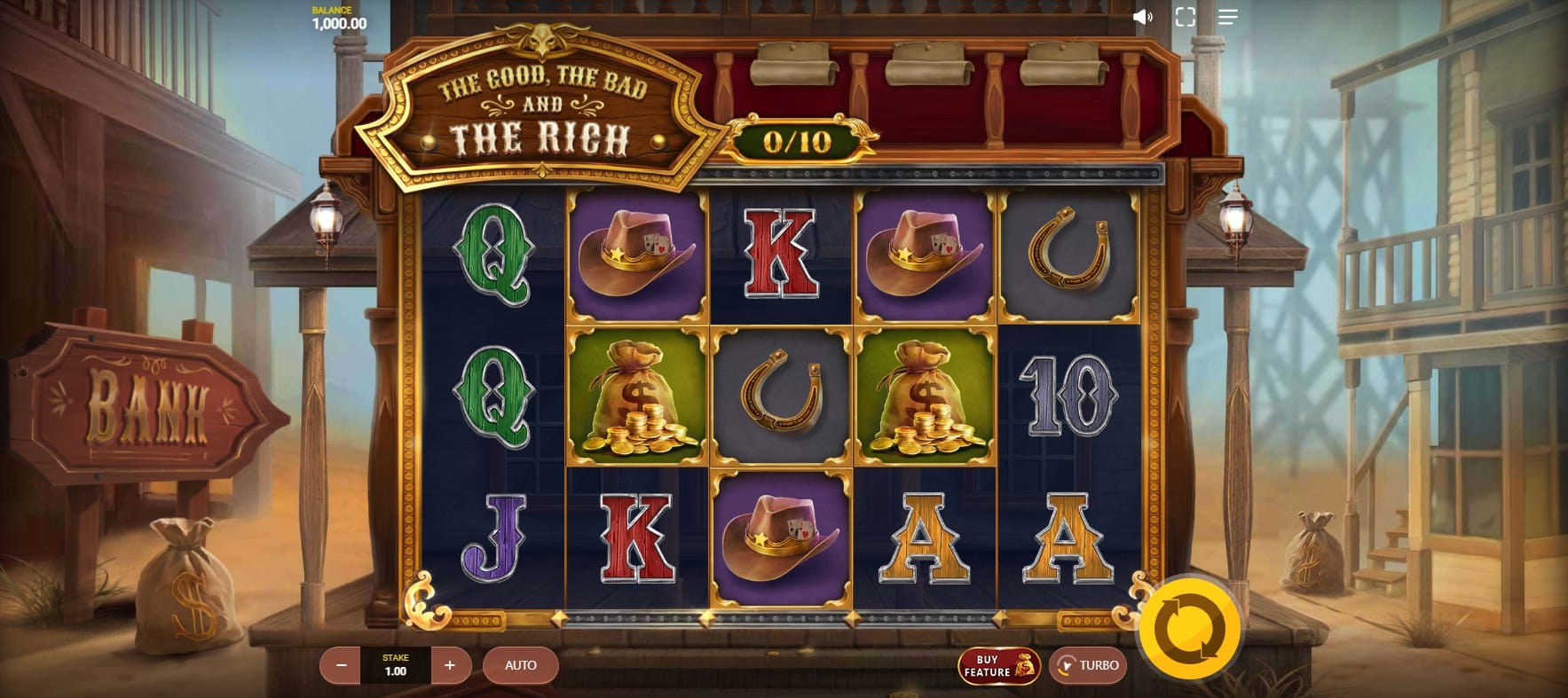 Visually, The Good, The Bad and The Rich is everything you’d expect from a Western slot. Set against a sunlit Western town square, the game displays a rustic saloon, jailhouse-style buildings, and dust blowing past piles of money scattered around—a bold visual metaphor for the game’s promise of lucrative wins.