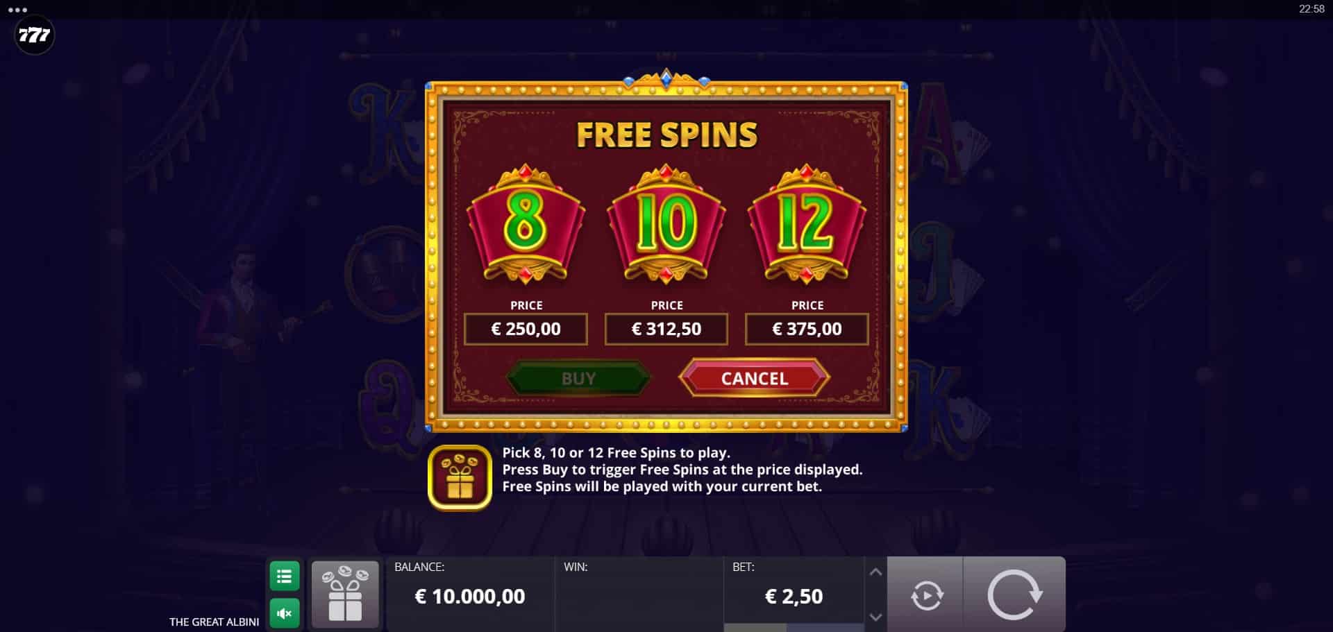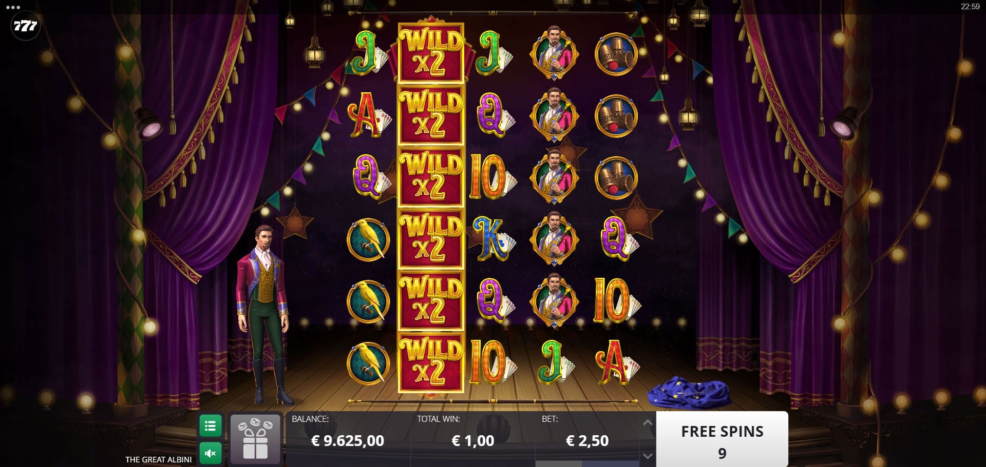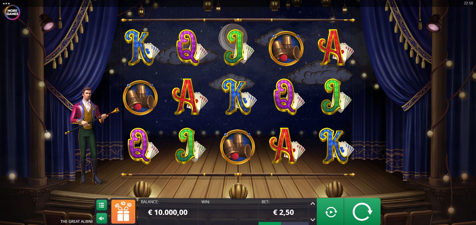 Played on a 5×3 grid with 25 paylines that can expand to 50 paylines during the bonus game, The Great Albini blends traditional slot structure with creative twists such as Mystery Box Respins, a 3×3 free spin trigger symbol and an expanded reel set during free spins. With a strong 96.6% RTP, high volatility, a maximum win of 4,000x, and bets ranging from €0.25 to €30, the game caters to players who enjoy theatrical feature-driven gameplay with explosive potential.