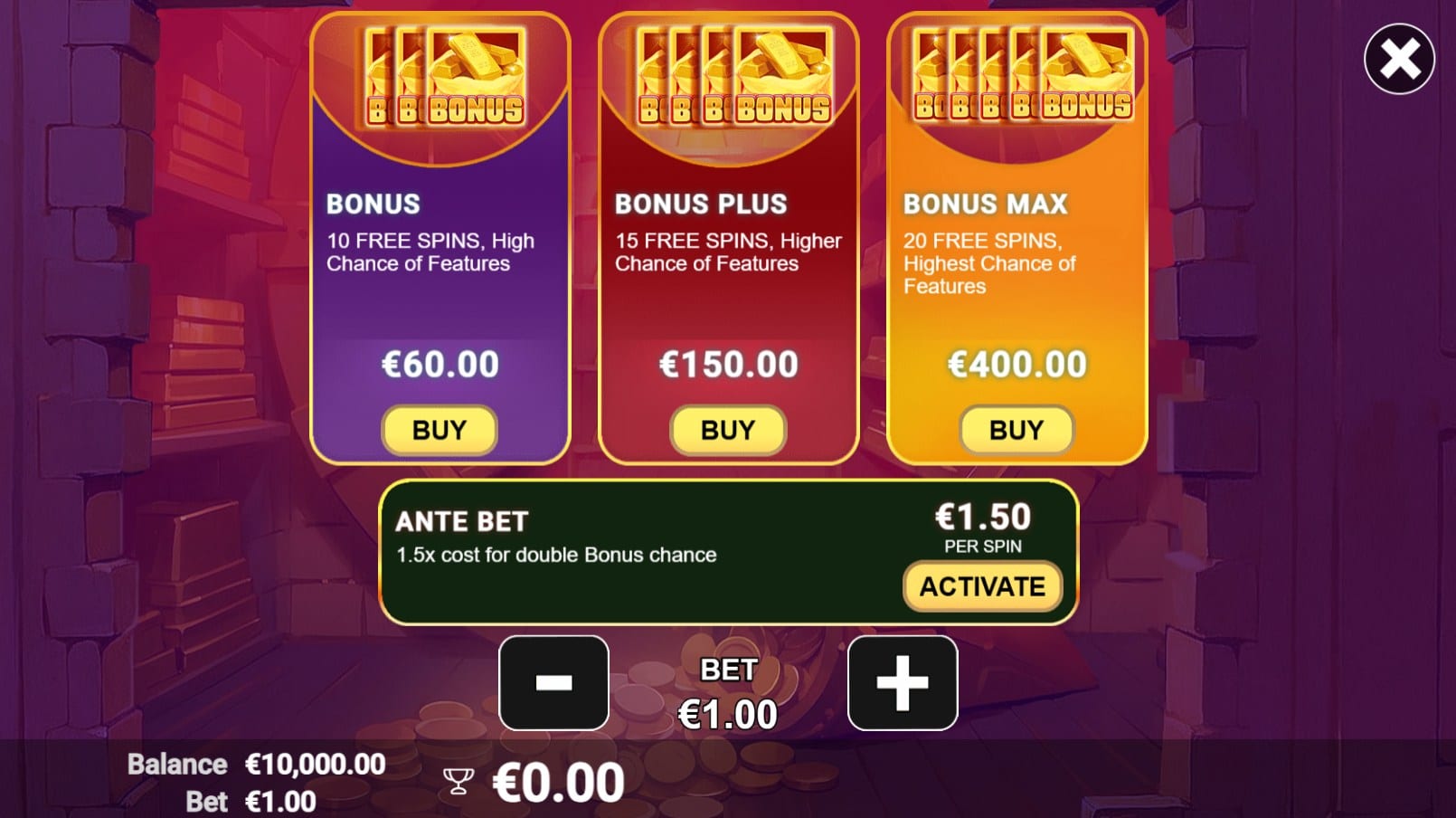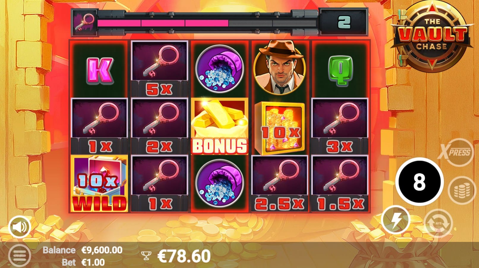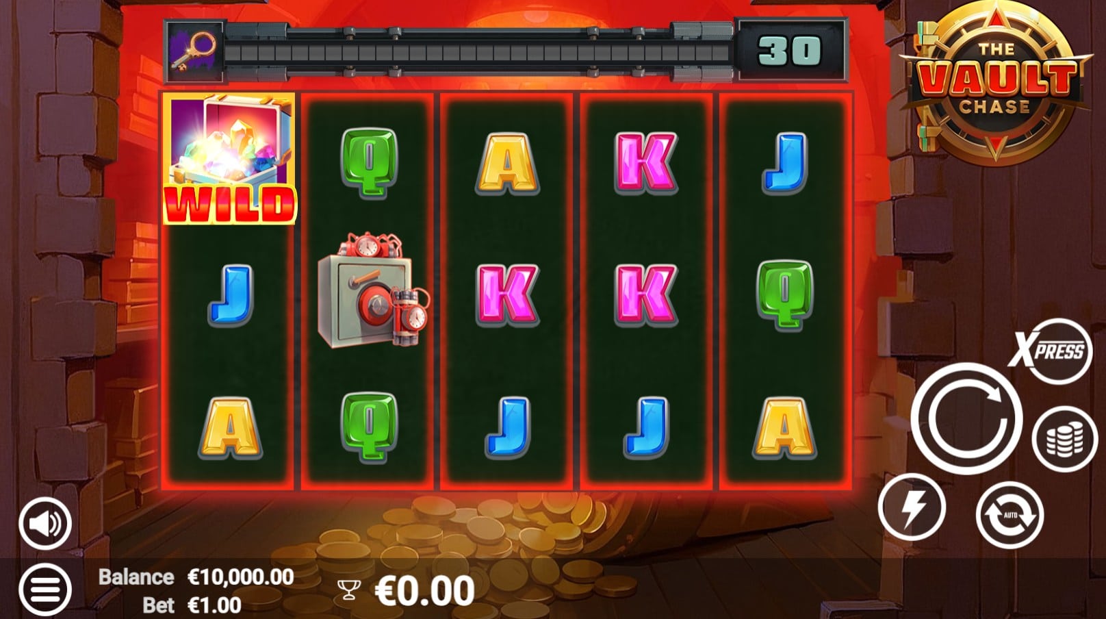 The Vault Chase caters to a broad range of players with a minimum bet of €0.10 and a maximum of €300 per spin.
