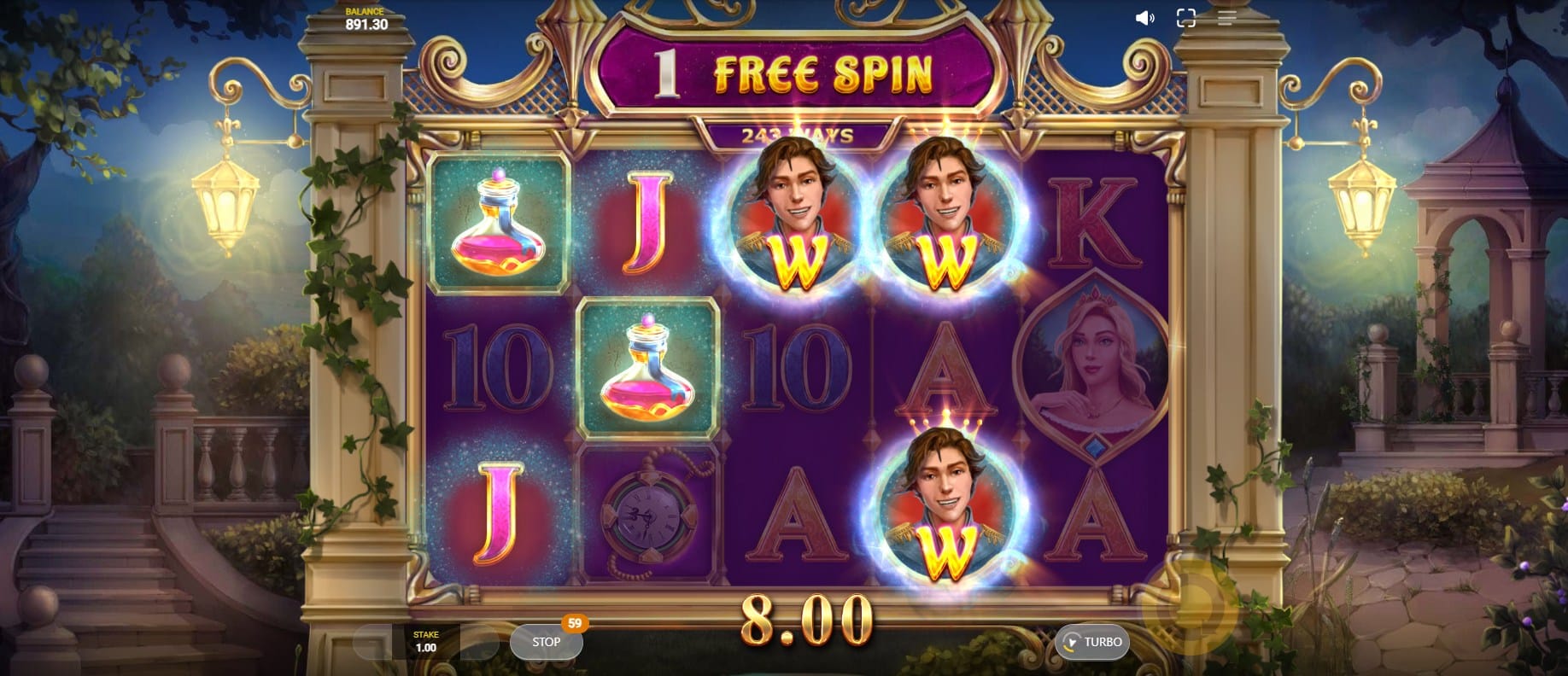 Here, the Princess appears in the middle of reel 5, locked in place. On each spin, she activates to transform all Frog Wilds and frames into Prince Wilds. When a Frog Wild lands, the free spins counter is reset to 3, keeping the round alive. However, if no Frog Wilds appear for three consecutive spins, the round ends.