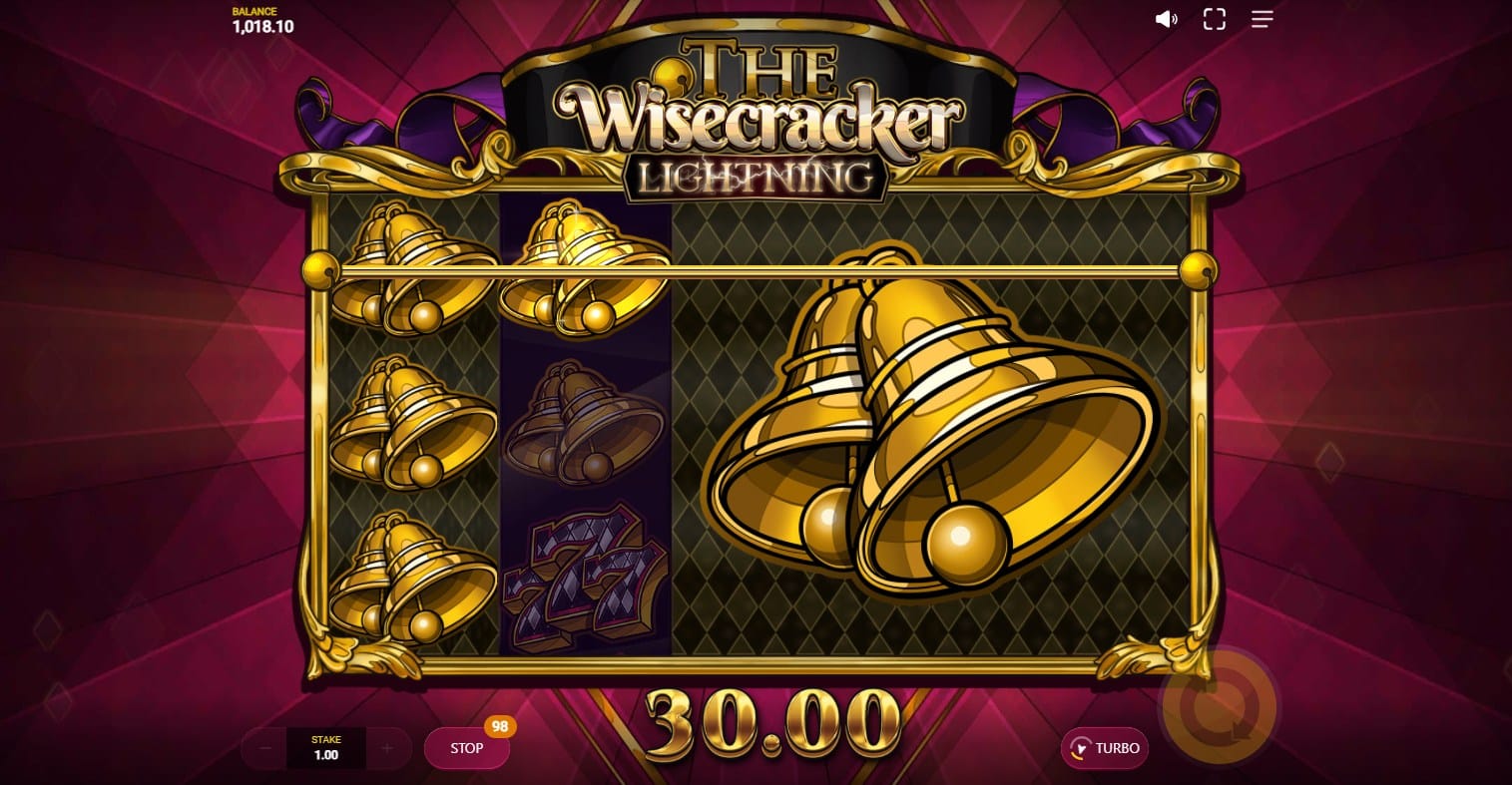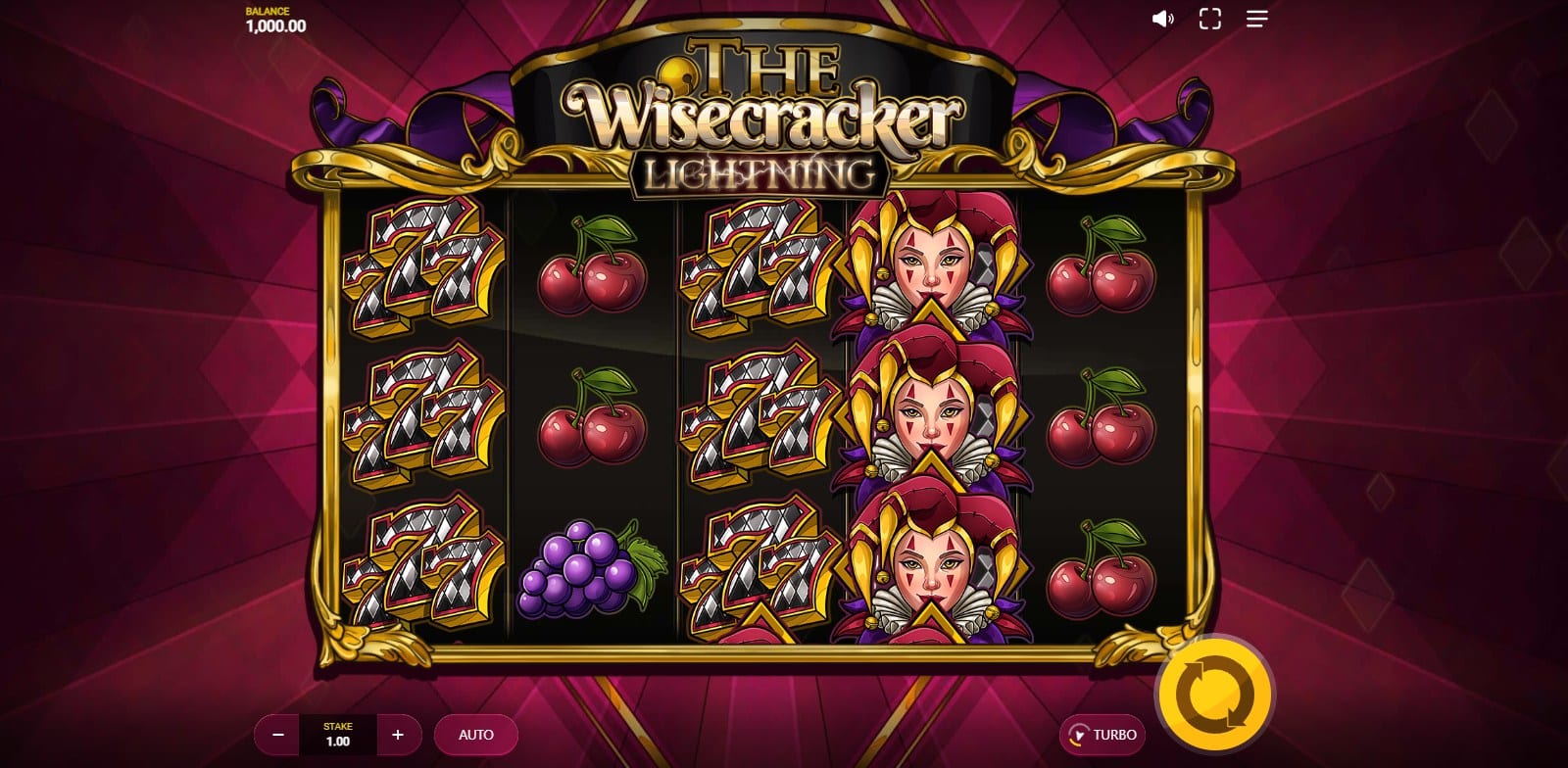 The Wisecracker Lightning doesn’t push visual boundaries — and that seems deliberate. It adopts a burgundy-colored, patterned background reminiscent of velvet stage curtains, framing the action with a golden trim that enhances the feel of an old-school fruit machine.