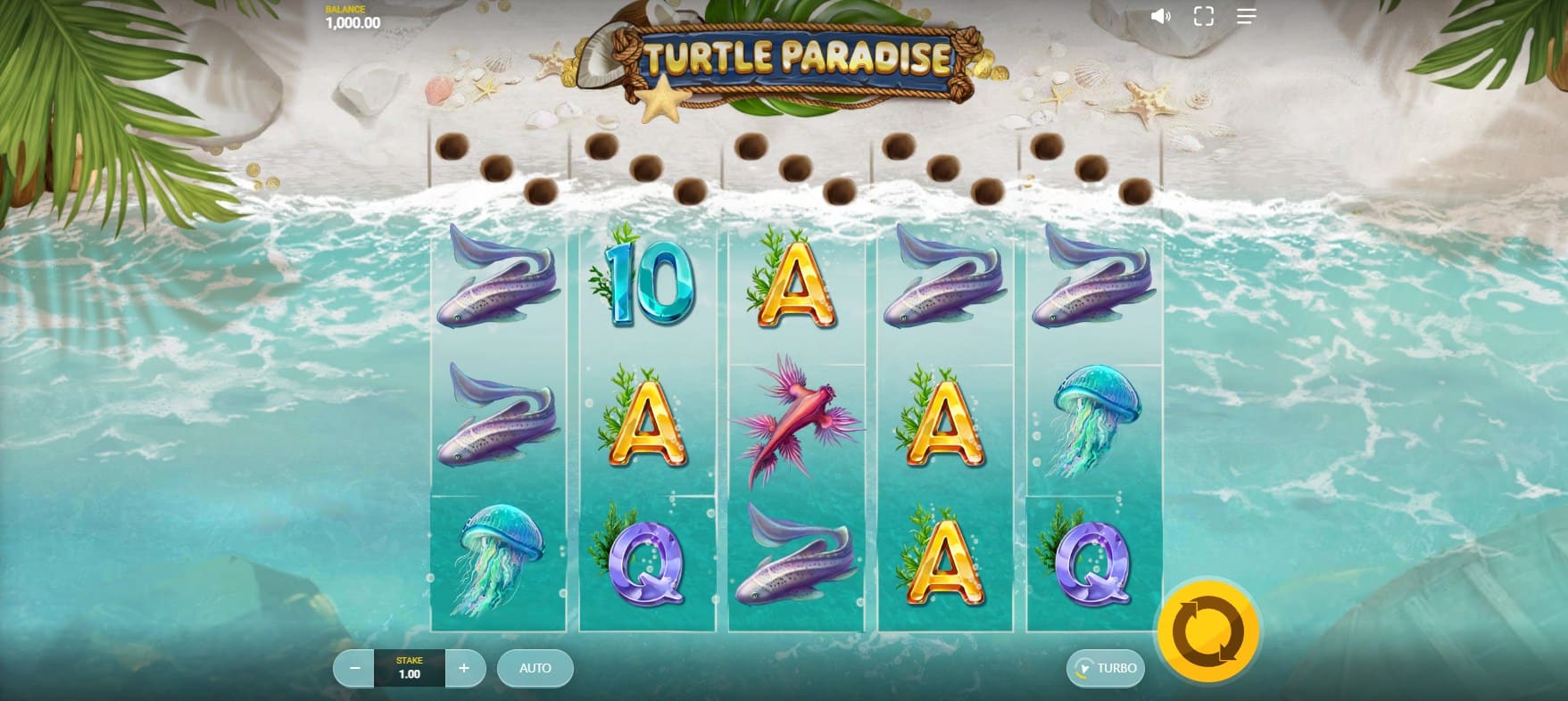 Turtle Paradise is visual escapism at its best. The game is set against a crystal-clear shoreline, with rippling waves that ebb beneath a see-through gaming grid. The backdrop—sun-bleached sands, soft coral tones, and glittering turquoise water—creates the calming sensation of standing on a quiet tropical beach.