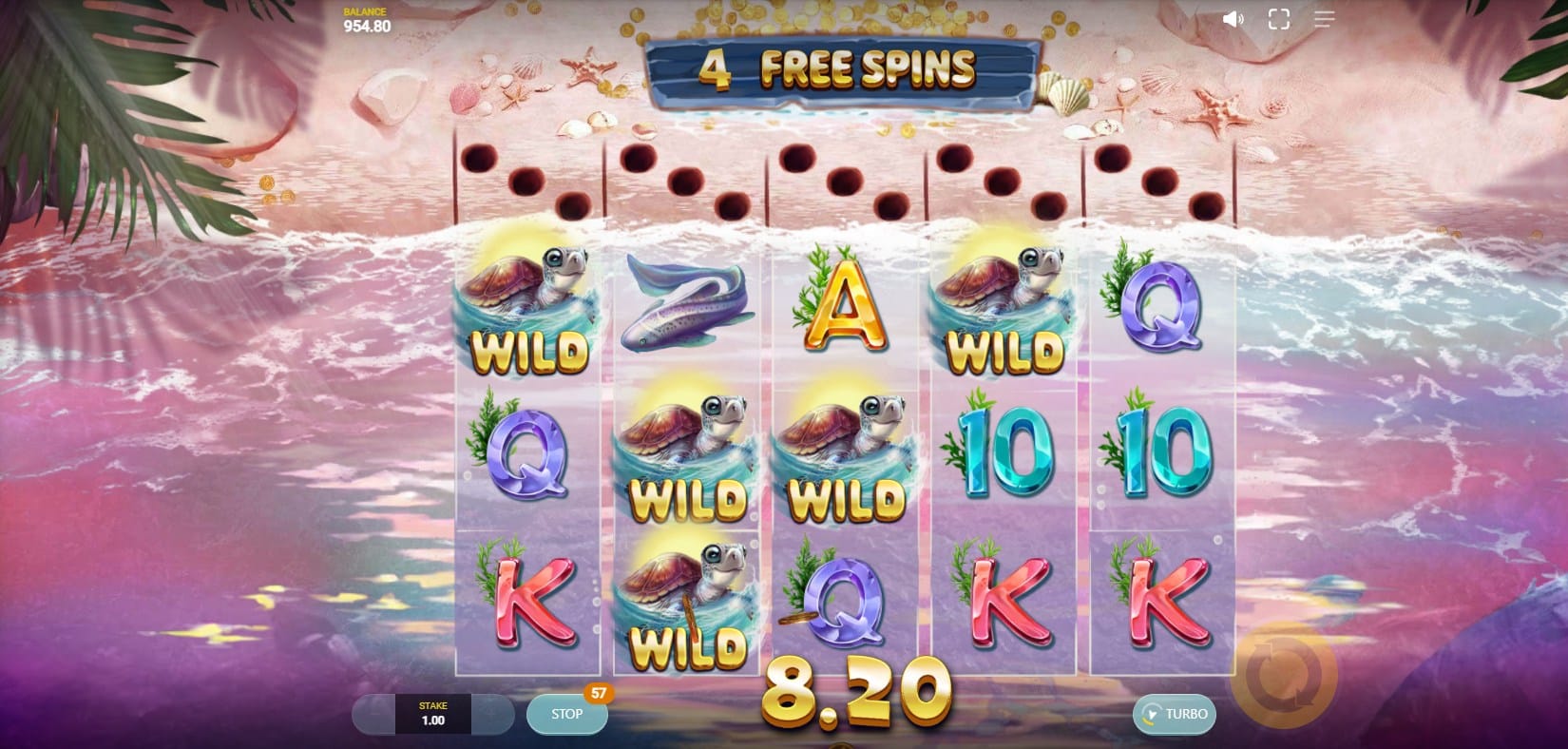 New Turtle Wilds during free spins add +1 extra spin and hatch into sticky wilds.