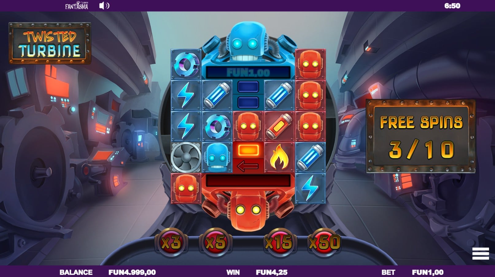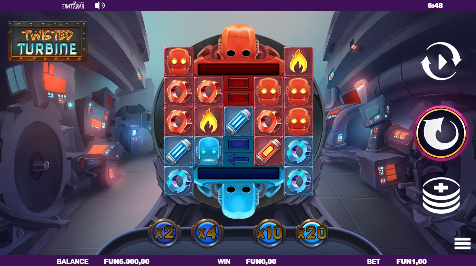 Twisted Turbine stands apart visually from almost everything Fantasma has produced. The game is set in an industrial robot facility—part factory, part laboratory—with futuristic panels, rotating turbines, glowing displays, and mechanical gadgets animating around the reels. The enormous spinning turbine behind the grid dominates the scene and reinforces the game’s theme: everything revolves around machinery and rotational energy.