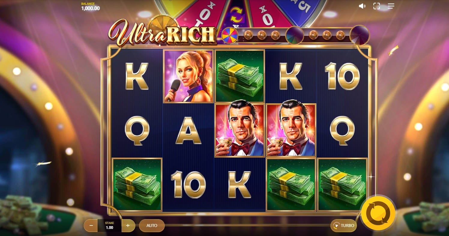 Ultra Rich is dressed to impress. The game opens with a luxurious backdrop filled with neon lights, roulette tables, gold, and velvet. The interface glows with upmarket extravagance, complete with a sparkling prize wheel bar that looms above the reels—always visible, always teasing what’s possible.