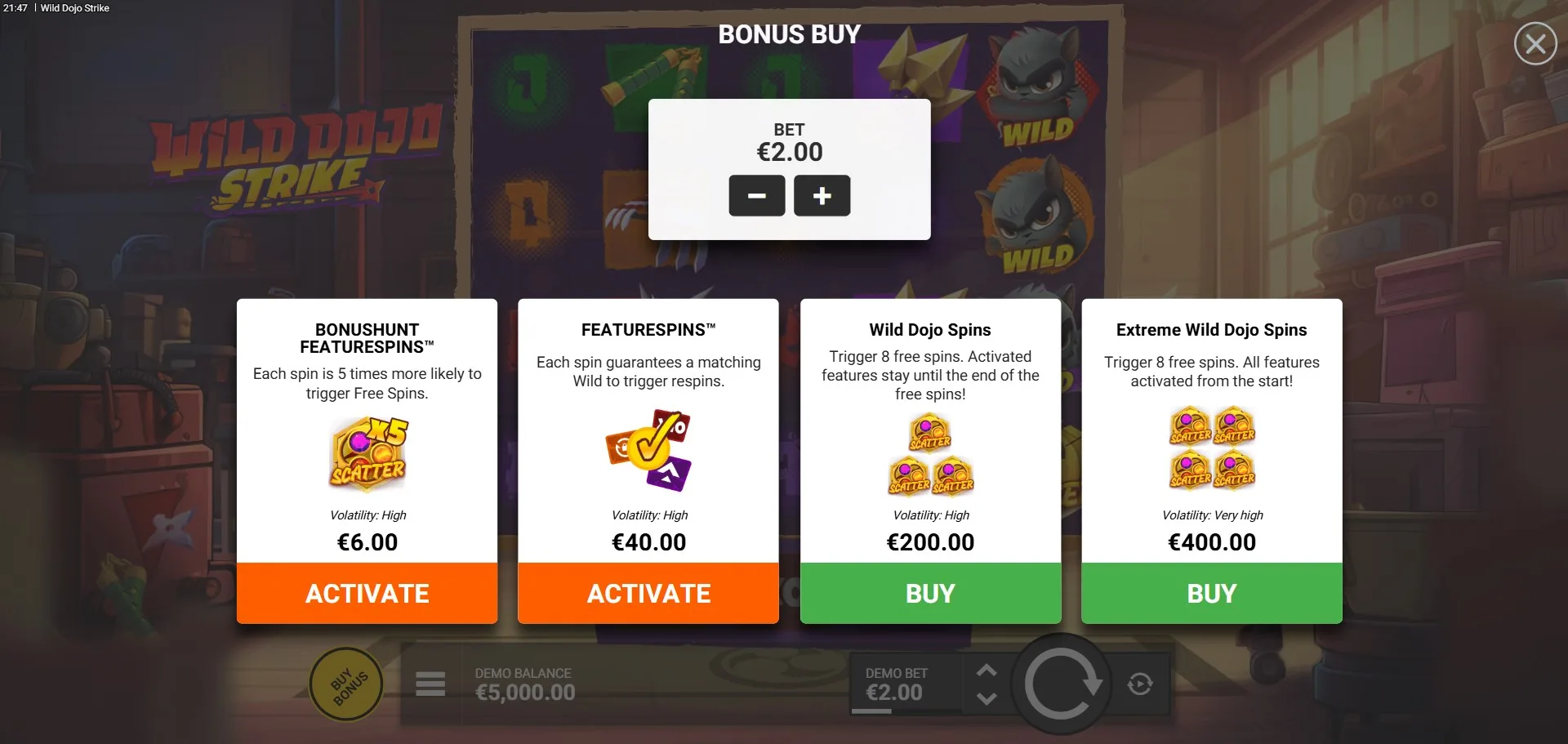 For players eager to jump straight into the action, Wild Dojo Strike offers four Bonus Buy options: